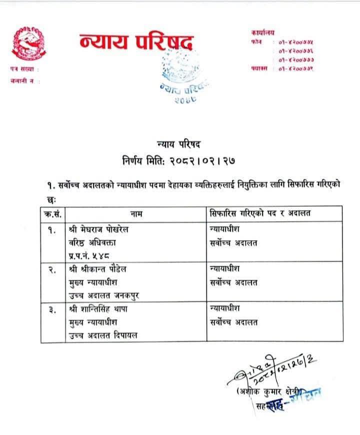 आज बसेको परिषद्को बैठकले वरिष्ठ अधिवक्ता मेघराज पोखरेल, उच्च अदालत जनकपुरका मुख्य न्यायाधीश श्रीकान्त पौडेल, उच्च अदालत दिपायलका मुख्य न्यायाधीश शान्तिसिंह थापालाई सिफारिस गरेको हो ।