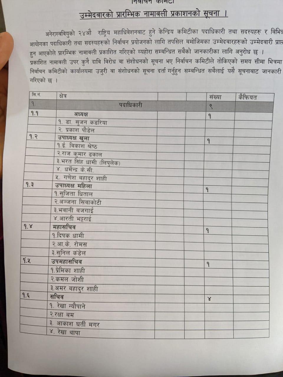 महासचिवमा दिपक धामी, आर के रोमस र सुनिल कँडेलको उम्मेदवारी परेको छ भने प्रेमिका शाही, कमल जोशी, अमरबहादुर शाहीले उपमहासचिवमा उम्मेदवारी दिएका छन् ।