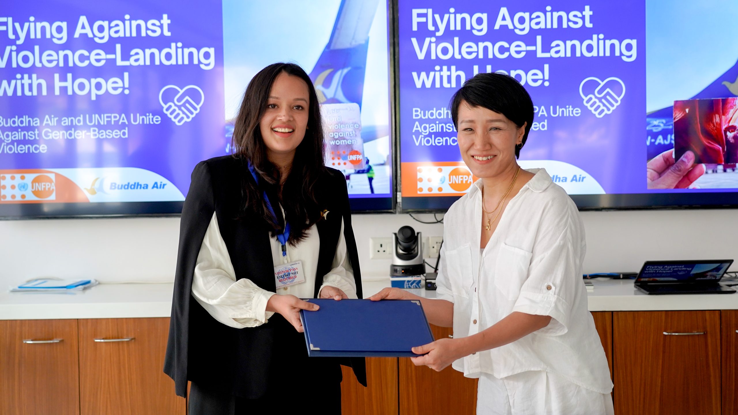 ललितपुरमा जेठ २८, २०८२ मा गरिएको सम्झौतामा, युएनएफपीएको तर्फबाट नेपालको लागी प्रतिनिधि वोन योङ हङ्ग र बुद्ध एयरका तर्फबाट कार्यकारी निर्देशक आस्था बस्नेत थापाले हस्ताक्षर गरेका छन् ।