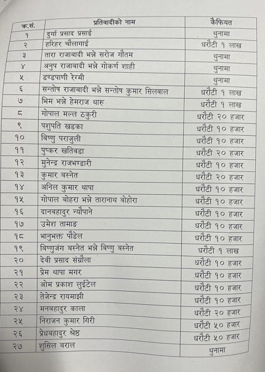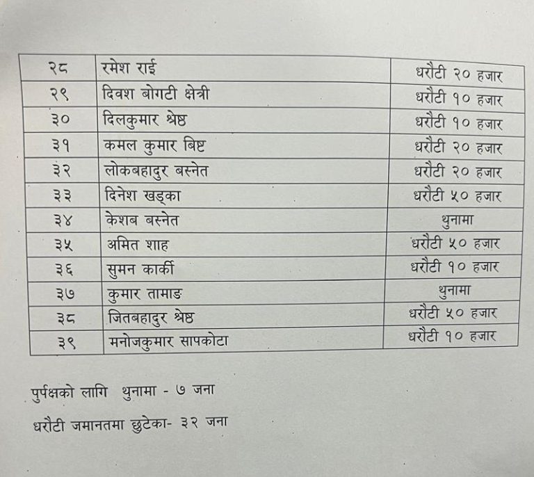 काठमाडौं । गत चैत १५ गते काठमाडौंको तीनकुनेमा भएको हिंसात्मक प्रदर्शन, तोडफोड र आजगनीमा संलग्न रहेको आरोपमा पक्राउ परेका ३९ जनामध्ये ७ जनालाइ कारारागारमै राखेर मुद्दाको पुर्पक्ष गर्न अदालतले आदेश दिएको छ । काठमाडौं जिल्ला अदालतले ३२ जनालाई भने धरौटीमा रिहा गर्ने आदेश दिएको छ ।