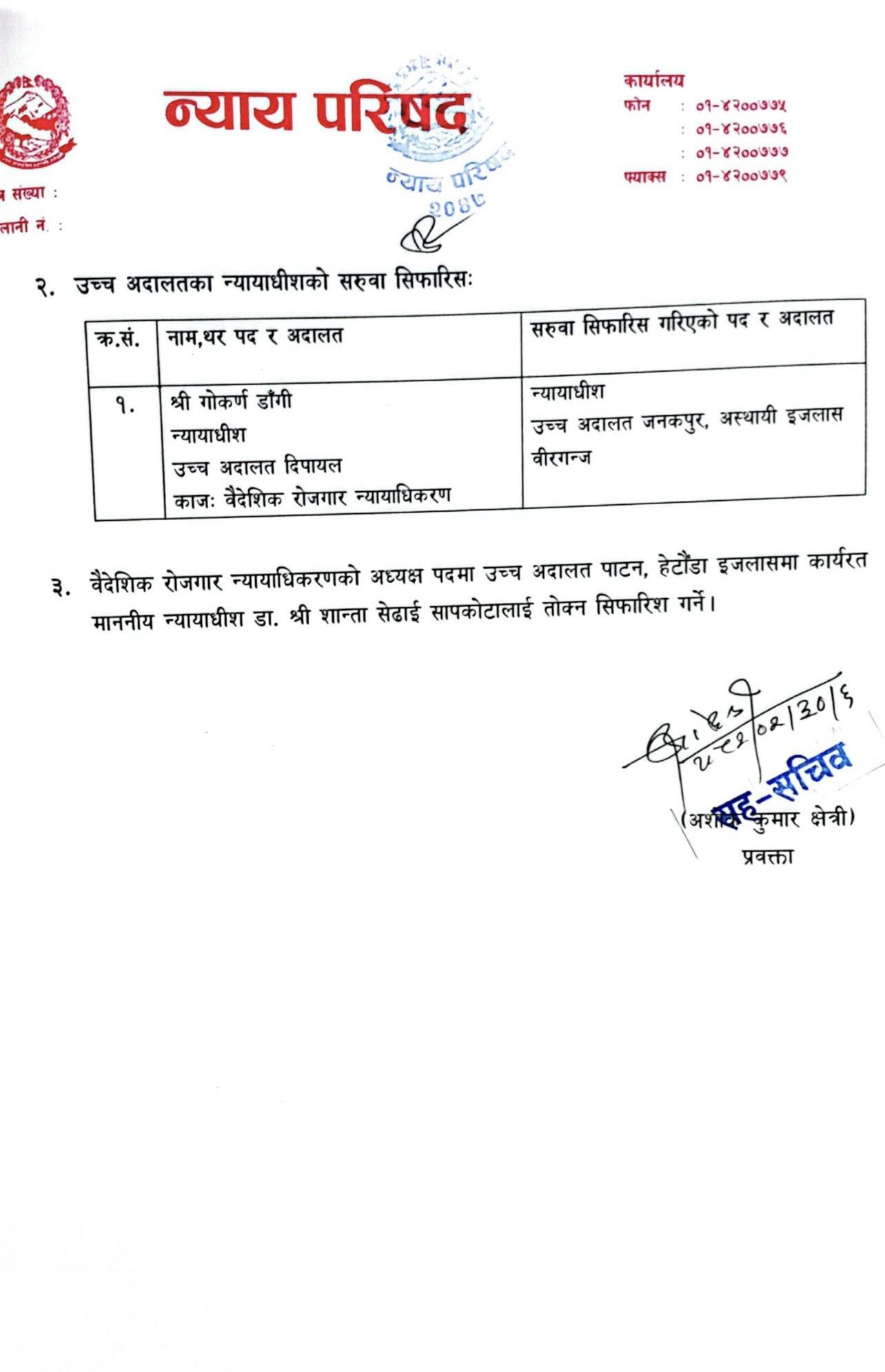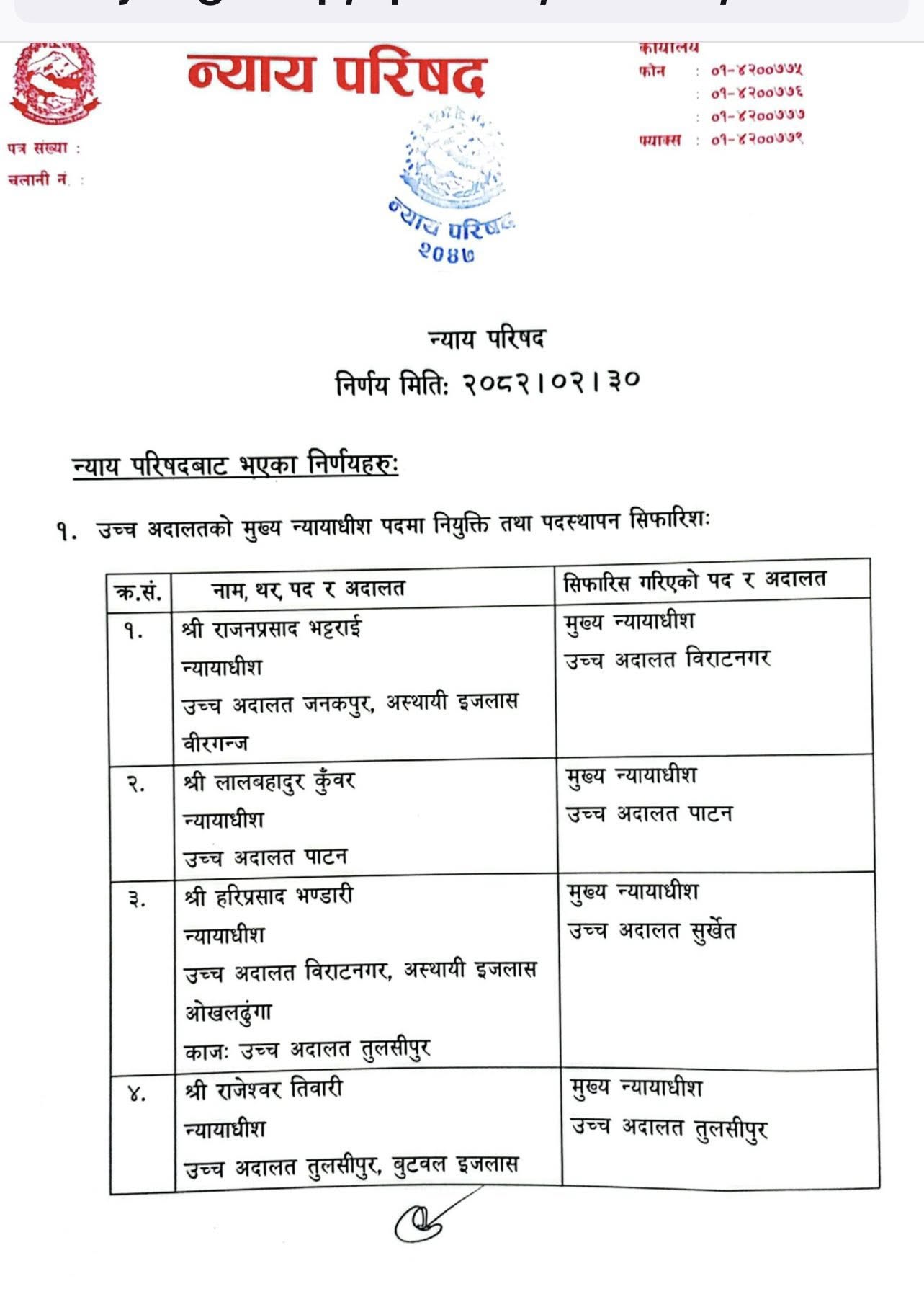 शुक्रबार बिहान बसेको न्याय परिषद बैठकले उच्च अदालतका न्यायाधीशहरु राजन प्रसाद भट्टराई , लालबहादुर कुँवर, हरिप्रसाद भण्डारी र राजेश्वर तिवारी लाई मुख्य न्यायाधीशमा सिफारिस गरेको हो ।
