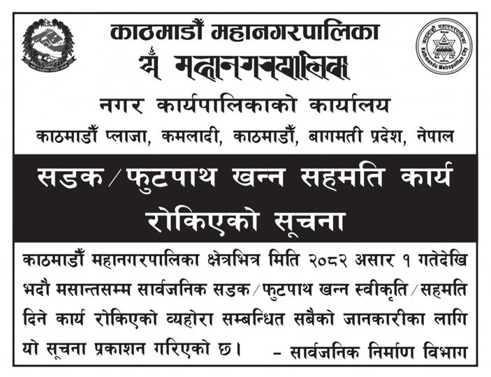 काठमाडौं । काठमाडौं महानगरपालिकाले आगामी भदौसम्म सार्वजनिक सडक र फुटबाट खन्न स्वीकृति नदिने भएको छ ।