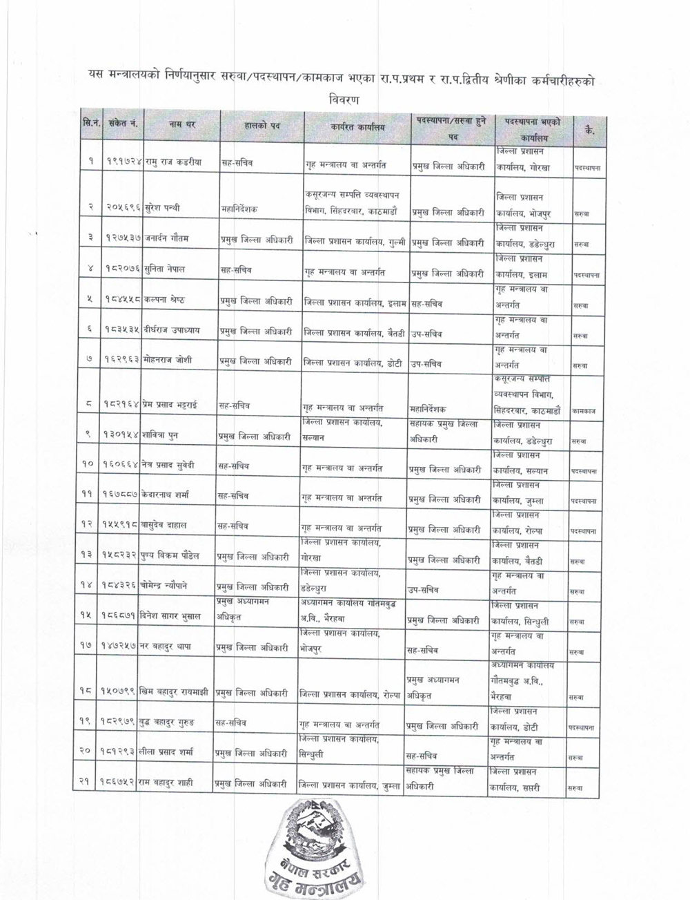 काठमाडौँ । गृह मन्त्रालयले २१ जना कर्मचारीको सरूवा गरेको छ ।