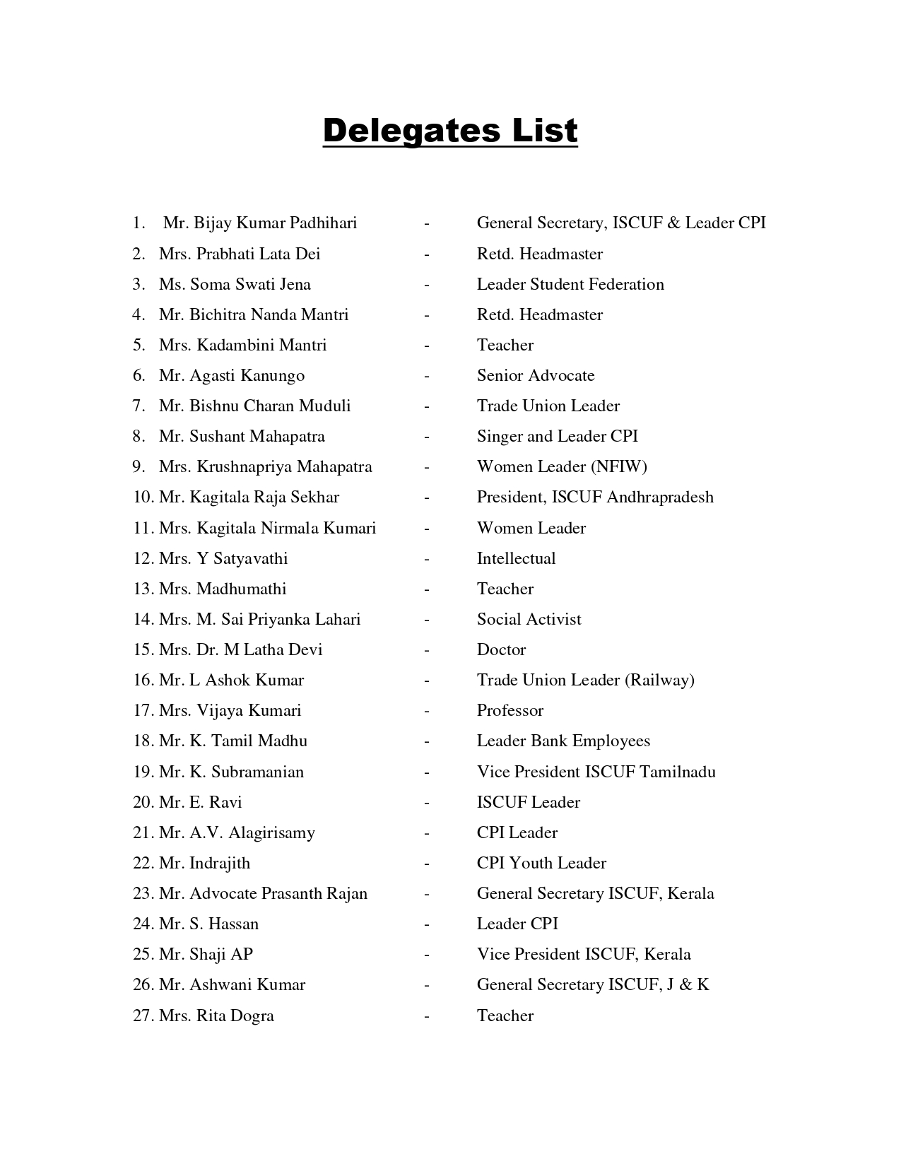 प्रतिनिधिमण्डलको नामावली