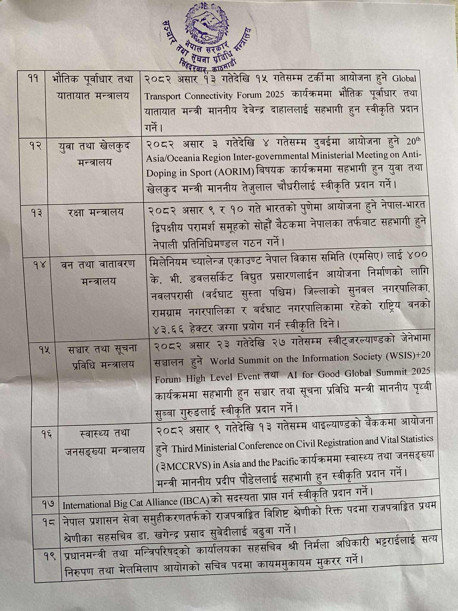 काठमाडौँ । सरकारले मन्त्रिपरिषद् बैठकका १९ वटा निर्णय सार्वजनिक गरेको छ ।