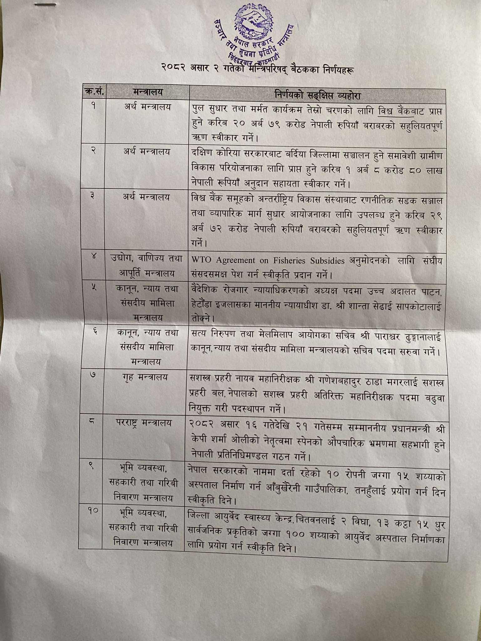 बुधबार सरकारका प्रवक्ता एवम् सञ्चार तथा सूचना प्रविधिमन्त्री पृथ्वी सुब्बा गुरुङले पत्रकार सम्मेलन गर्दै असार २ गते बसेको मन्त्रिपरिषद् बैठकका १९ वटा निर्णय सार्वजनिक गरेका हुन् ।