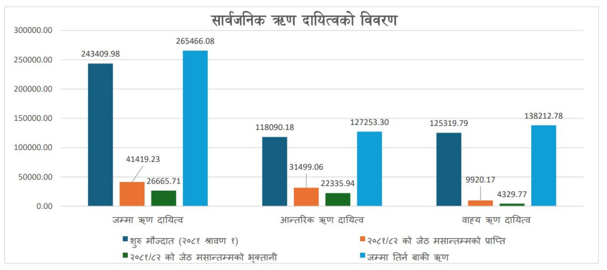 जसमध्ये आन्तरिक र वाह्य ऋण प्राप्तिको प्रगति कमशः १५ दशमलव ४५ र ४५ दशमलव ७२ प्रतिशत रहेको छ । कुल सार्वजनिक ऋण प्राप्ति मध्ये आन्तरिक र वाह्य ऋणको हिस्सा क्रमश ७६ दशमलव ९५ र २३ दशमलव ९५ प्रतिशत रहेको छ । सार्वजनिक ऋणको सावाँ र व्याज भुक्तानीतर्फ चालु आर्थिक वर्ष २०८१/८२ मा ऋण सेवा खर्चमा रु ४ खर्ब २ अर्ब ८५ करोड बजेट विनियोजन भएकोमा जेठ मसान्तसम्म ३ खर्ब २९ अर्व ६९ करोड भुक्तानी भएको छ ।