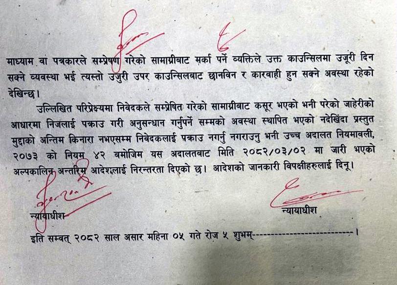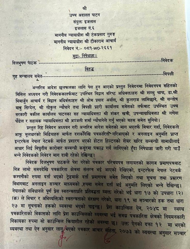 पत्रकार पाठकले आफूविरुद्ध पक्राउ पुर्जी जारी भएको भन्दै उच्च अदालतबाट दायर गरेको रिटमा विहीबार न्यायाधीश टंकप्रसाद गुरुङ र टीकाराम आचार्यको संयुक्त इजलासले यस्तो आदेश दिएको हो ।
