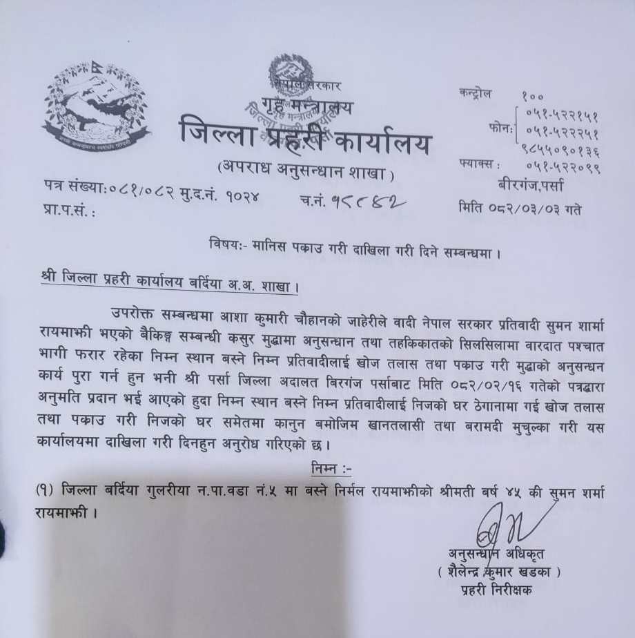 यसैबीच जिल्ला प्रहरी कार्यालय पर्साले असार ३ गते बर्दिया प्रहरीलाई एक पत्र लेखी सुमनलाई पक्राउ गरी बुझाइदिन आग्रह गरेको छ । सुमन बर्दियाकी भएकाले प्रहरीले सम्बन्धित जिल्लाको प्रहरीलाई पत्राचार गरेको हो ।