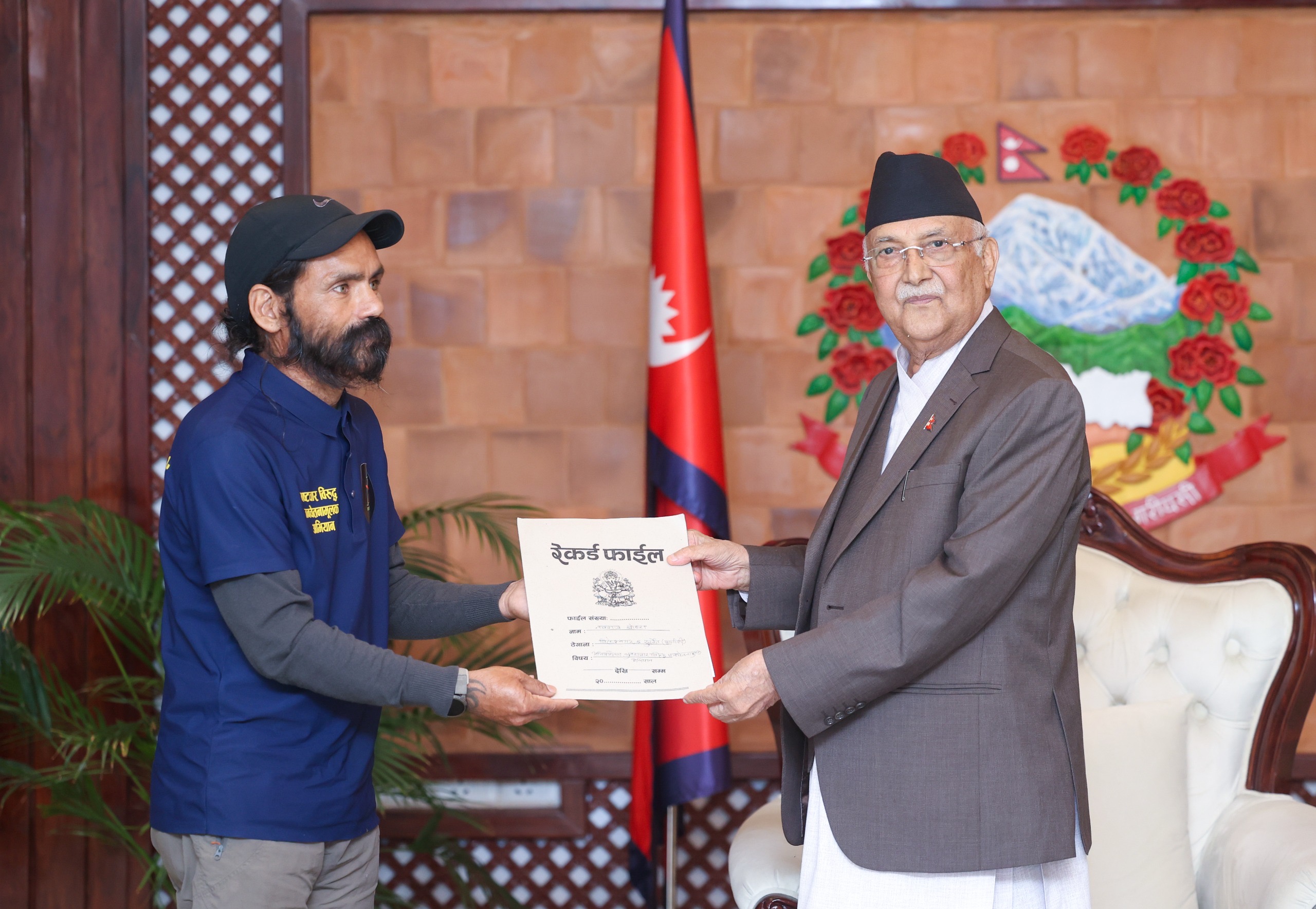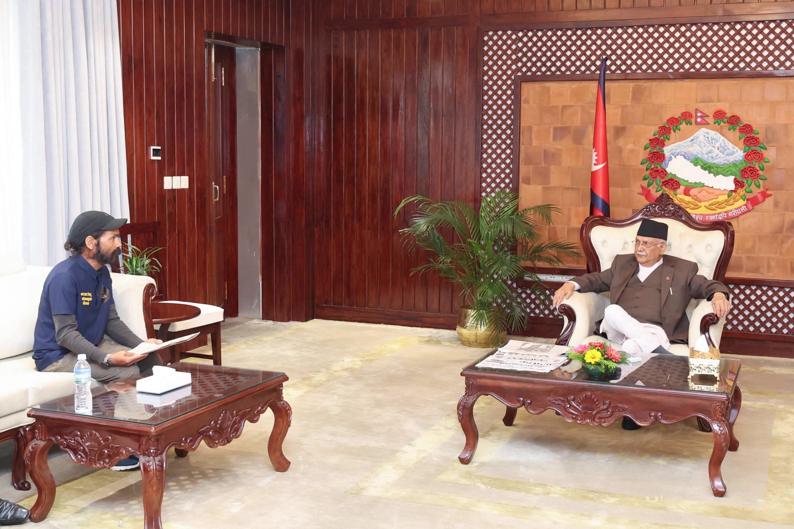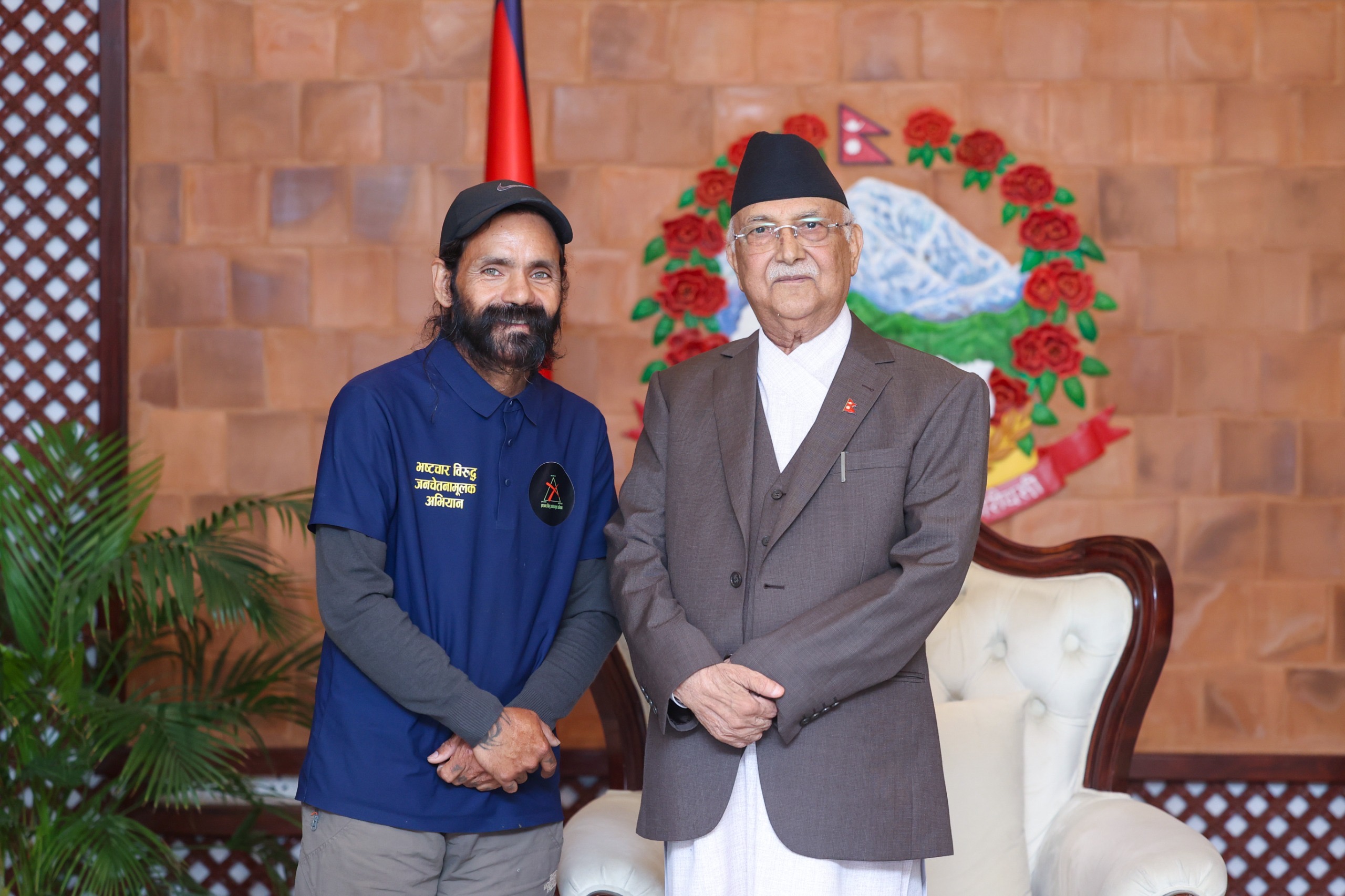 काठमाडौं, ८ असार । प्रधानमन्त्री केपी शर्मा ओलीसँग सुर्खेतबाट खाली खुट्टा हिँडेर काठमाडौँसम्मको यात्रा पूरा गरेका अभियानकर्मी नवराज बोहराले आज प्रधानमन्त्री निवास, बालुवाटारमा भेट्नुभएको छ ।