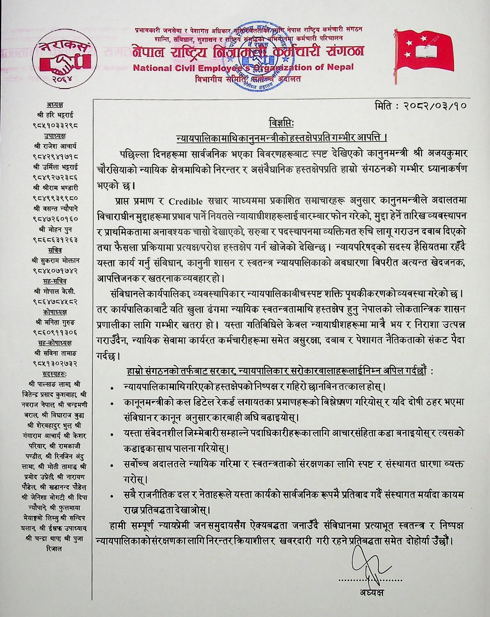 न्यायपालिकामाथि कानुनमन्त्रीको हस्तक्षेपप्रति निजामती कर्मचारी संगठनले जनायो आपत्ति