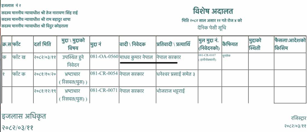 विशेष अदालतको दैनिक पेसी सूचीमा इजलास नम्बर २ मा माधवकुमार नेपालको मुद्दा पहिलो नम्बरमै राखिएको छ ।