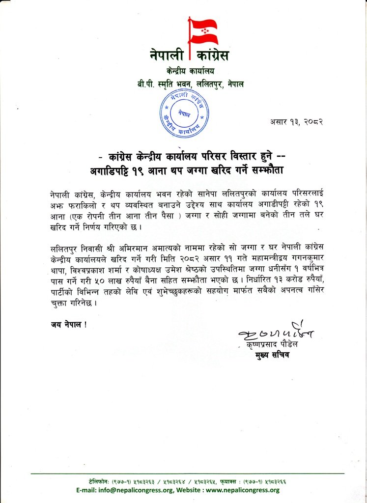 पौडेलद्वारा जारी विज्ञप्तिमा भनिएको छ, ‘नेपाली कांग्रेस, केन्द्रीय कार्यालय भवन रहेको सानेपा ललितपुरको कार्यालय परिसरलाई अझ फराकिलो र थप व्यवस्थित बनाउने उद्देश्य साथ कार्यालय अगाडिपट्टि रहेको १९ आना (एक रोपनी तीन आना तीन पैसा ) जग्गा र सोही जग्गामा बनेको तीन तले घर खरिद गर्ने निर्णय गरिएको छ ।’