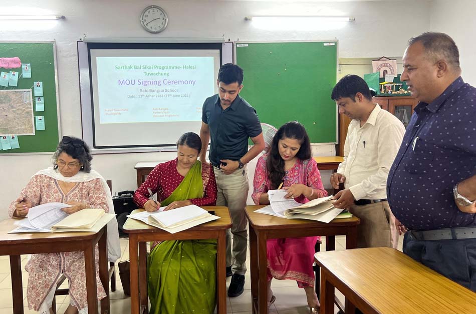 शैक्षिक गुणस्तर सुधारमा साझेदारी गर्ने विषयमा नगरप्रमुख राई, रातो बङ्गला स्कुलका निर्देशक शान्ता दीक्षित र फाउन्डेसनका टोलीप्रमुख एलिना रञ्जितले समझदारीपत्रमा हस्ताक्षर गर्नुभएको हो । यसरी त्रिपक्षबीच भएको समझदारीपत्रमा नगरपालिकाका प्रमुख प्रशासकीय अधिकृत वसन्त गिरी, रातो बङ्गला स्कुलका कार्यक्रम संयोजक अर्चना जोशी, रातो बङ्गला फाउन्डेसनका लेखाप्रमुख हरिप्रसाद पुडासैनी र हलेसी तुवाचुङ नगरपालिका–५ का अध्यक्ष रुपेन्द्रकुमार राई साक्षी बस्नुभएको छ ।