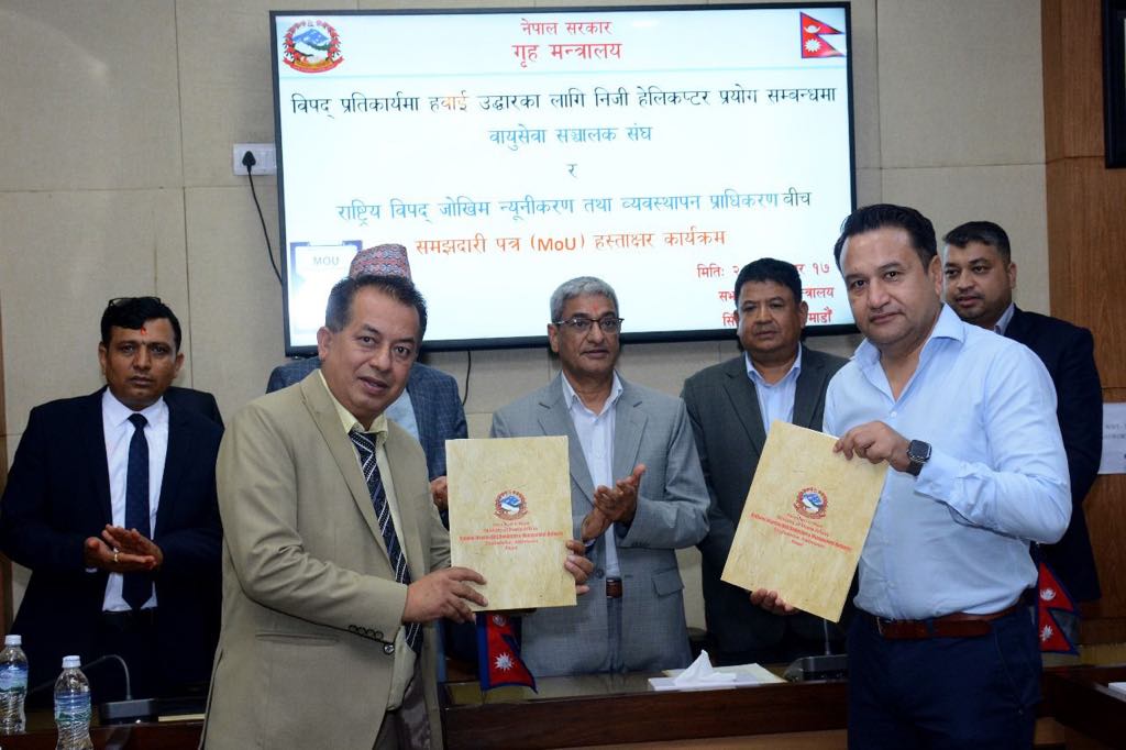गृहमन्त्री रमेश लेखकको रहोवरमा गृह मन्त्रालय अन्र्तगत राष्ट्रिय विपद् जोखिम न्यूनीकरण तथा व्यवस्थापन प्राधिकरण र वायुसेवा सञ्चालक संघ वीच हवाई उद्दारका लागि सम्झौता भएको हो ।