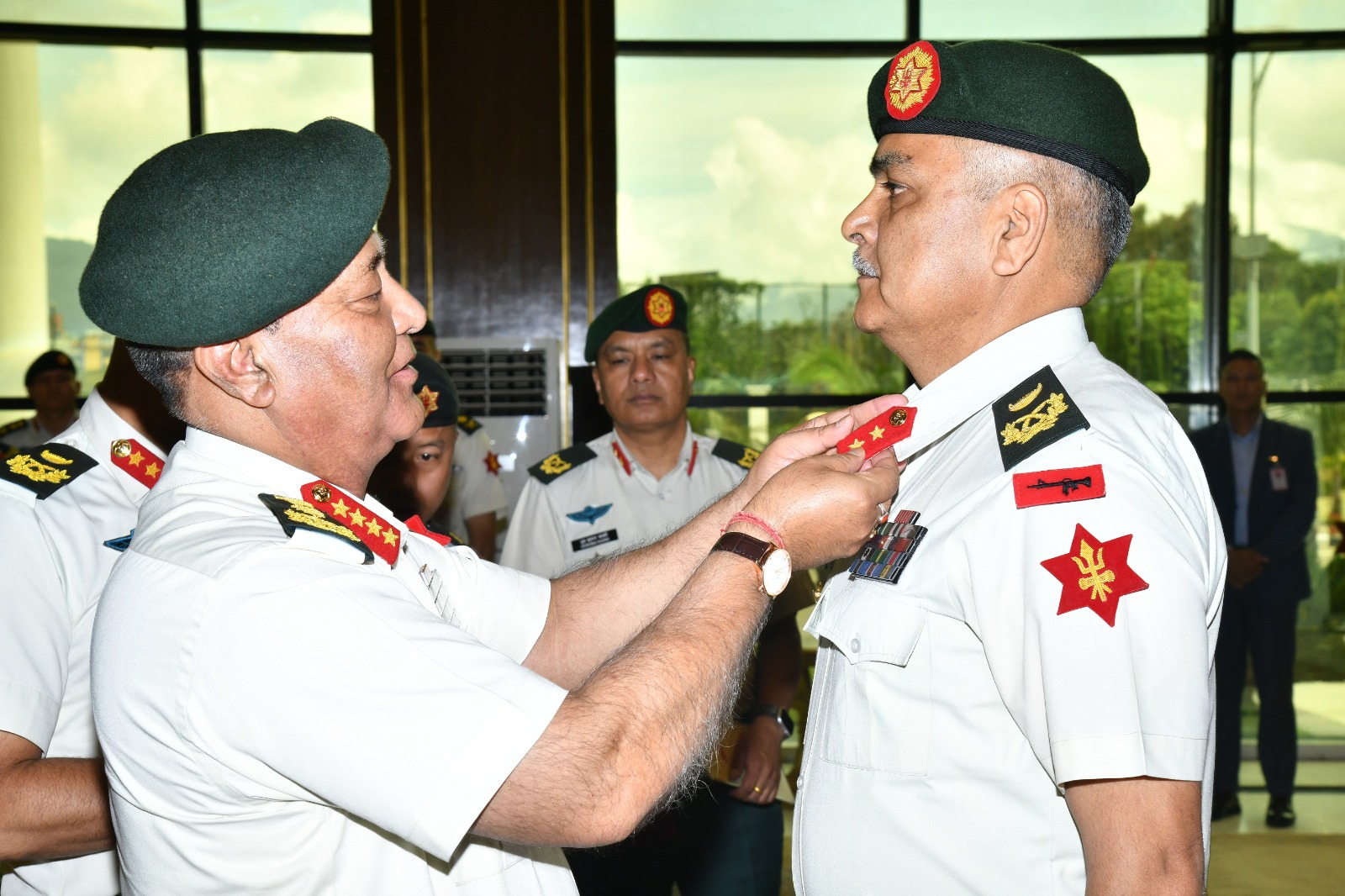 काठमाडौँ । नेपाली सेनाका प्रधानसेनापति अशोकराज सिग्देलले उपरथी दर्जामा बढुवा हुनुभएका रवीन्द्र खत्रीलाई दर्ज्यानी चिह्न प्रदान गर्नुभएको छ ।