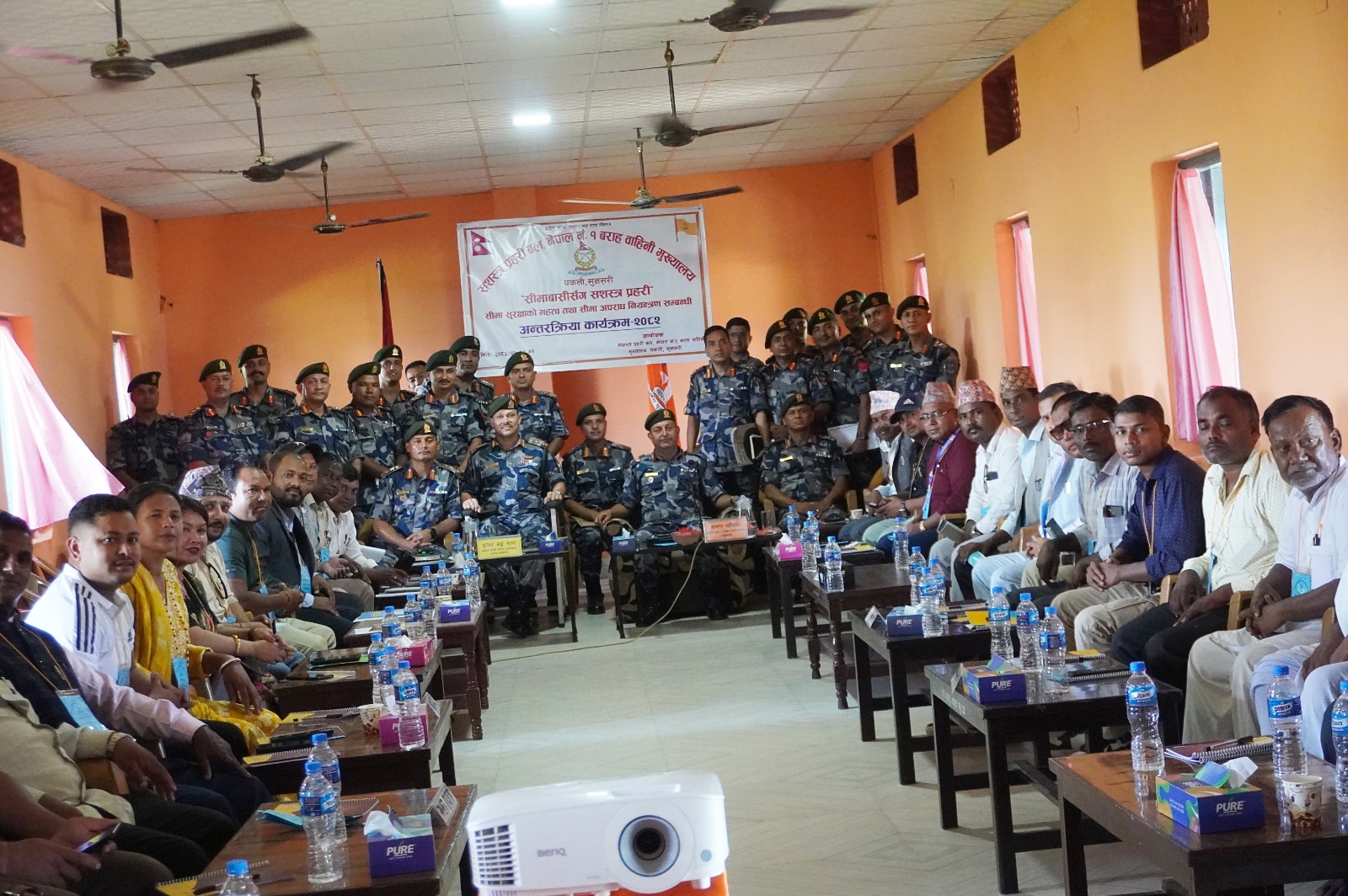 सशस्त्र प्रहरीले सीमा सुरक्षा सुदृढीकरणलाई दीर्घकालीन प्राथमिकताका रूपमा लिँदै सीमावासीहरूसँग सहकार्य र समन्वय मजबुत बनाउने घोषणा गरेको हो । सशस्त्र प्रहरी बल, नेपाल नं १ बराह बाहिनी मुख्यालय पकली, सुनसरीले आज ‘सीमावासीसँग सशस्त्र प्रहरी’ अन्तक्र्रिया गरेको थियो । सो अन्तक्र्रियामा सीमा अपराध नियन्त्रणका लागि स्थानीय तहसँग सहकार्य गर्ने सशस्त्र प्रहरी वरिष्ठ उपरीक्षक सुधीरजङ्ग थापाले बताउनुभयो ।