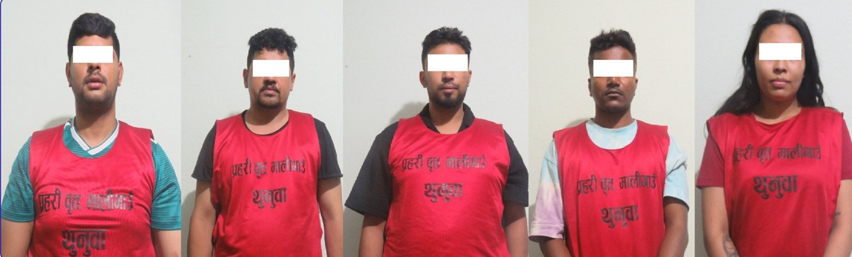 पक्राउ परेका दर्शन सापकोटा, २१ वर्ष, बुढानिलकण्ठ नगरपालिका–११ काठमाडौं, सन्देश बहादुर भट्ट १९ वर्ष गोकर्णेश्वर नगरपालिका–४, हाल बसन्तबारी होटल काठमाडौं–४, आयुष श्रेष्ठ २६ वर्ष इन्द्रावती गाउँपालिका–२ सिन्धुपाल्चोक, हाल बाफल, काठमाडौं–६, प्रकाश यादव २२ वर्ष विष्णुपुर गाउँपालिका–८ सर्लाही हाल झमेलो ललितपुर–१ र सुजन अधिकारी ३८ वर्ष ललितपुर महानगरपालिका–४ हाल बालुवाटार काठमाडौं–४ बाट कोकिन जस्तो देखिने लागू औषध – ६५.१३ ग्राम, LSD जस्तो देखिने लागू औषध – ३ थान, विभिन्न कम्पनीका मोबाइल – ५ थान, इलेक्ट्रोनिक तराजु – १ थान, Vespa स्कुटर – १ थान , नेपाली नगद – रु २,११,००० (अक्षरेपी दुई लाख एघार हजार) र  लागू औषध प्याक गर्न प्रयोग हुने प्लास्टिक खोलहरुसहित पक्राउ गरेको हो ।
