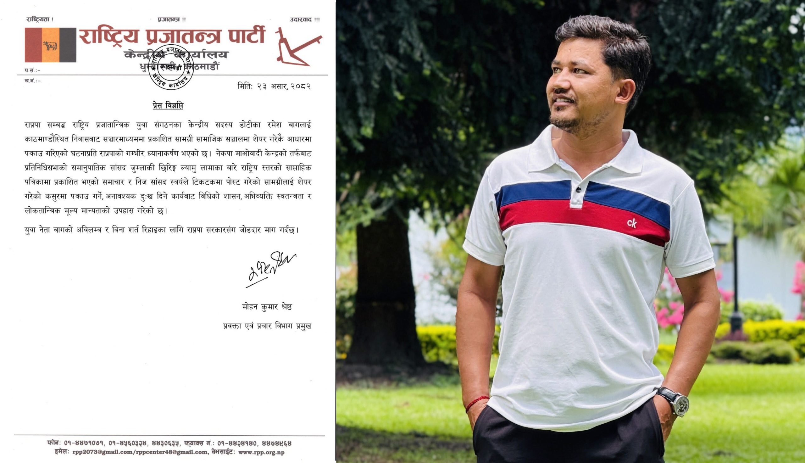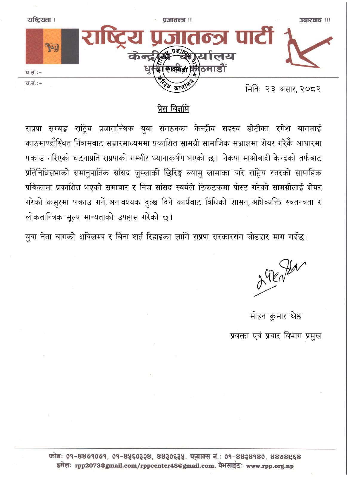 सञ्चारमाध्यममा प्रकाशित सामग्री सामाजिक सञ्जालमा शेयर गरेकै आधारमा निवासबाट पक्राउ गरेकामा विरोध जनाउँदै राप्रपाले युवा नेता बागको अविलम्ब र बिना शर्त रिहाइका लागि सरकारसँग जोडदार माग समेत गरेको छ ।