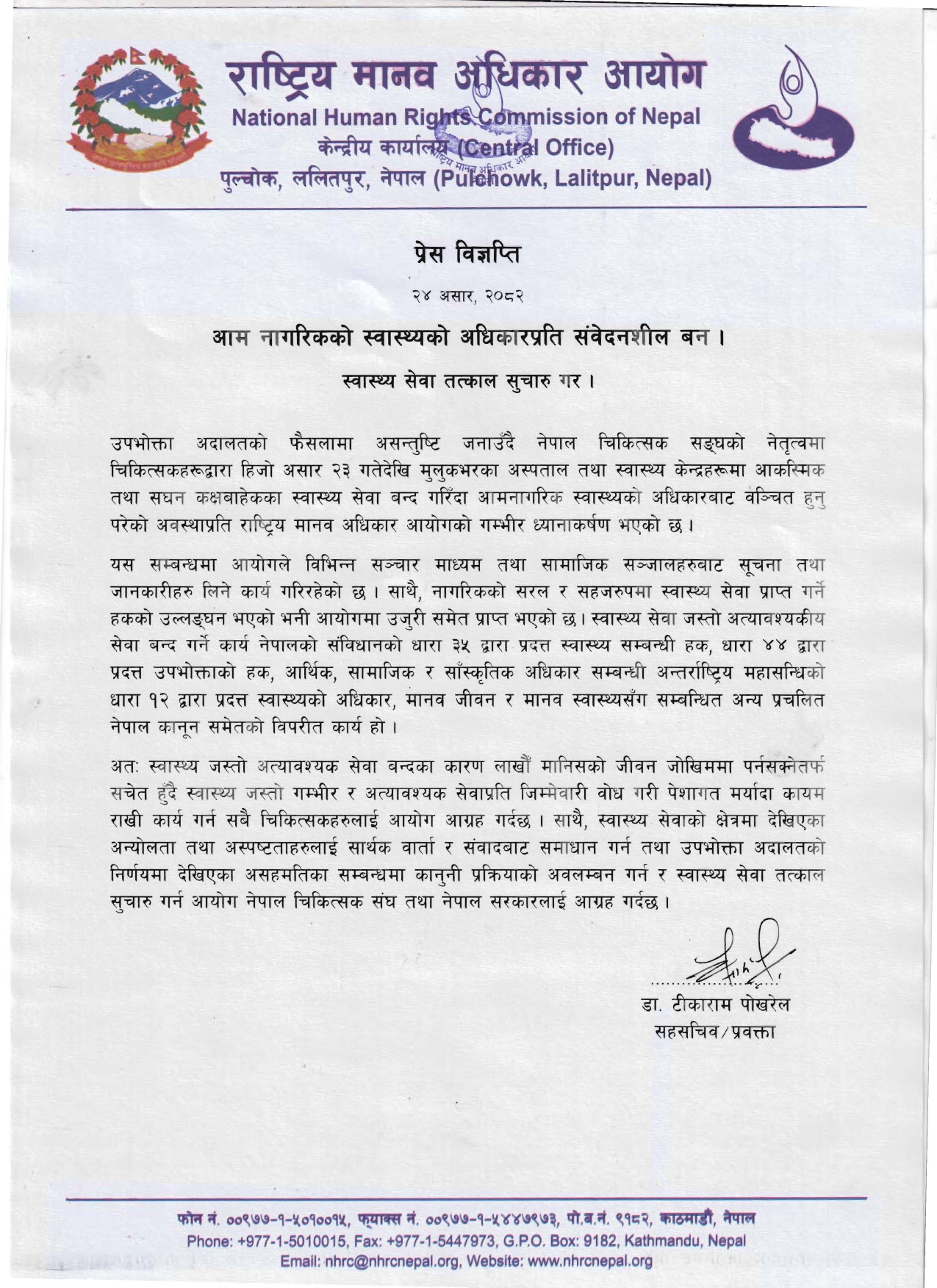 आयोगले सहसचिव एवं प्रवक्ता डा. टिकाराम पोखरेलबाट एक विज्ञप्ति जारी गर्दै चिकित्सक संघको नेतृत्वमा हिजोबाट जारी आन्दोलनका कारण नागरिकहरू अधिकारबाट वञ्चित भएकोप्रति ध्यानाकर्षण गराएको छ ।
