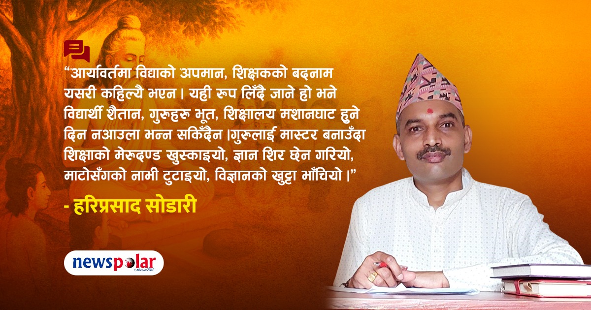 वैदिक शिक्षापद्धतिमा विद्या+आलय (विद्याको घर) थियो, अब विद्या+लय अर्थात् विद्याकै नाश हुने ठाउँ बन्न थाले शिक्षणसंस्थाहरु । विद्यालय राजनीति गर्ने अखडा बने, विश्वविद्यालय ढु∙ा–मुडा चलाउने मैदान भए । लोकतन्त्रको आगोले शिष्यको सपना जलाइदियो, गणतन्त्रको ज्वालाले छात्रछात्राहरुको भविष्य पलायन गरायो, निजीकरणले विपन्न तर मेधावी छात्रछात्राहरुले बौद्धिक क्षमतालाई गुमनाम गराए । आर्यावर्तमा विद्याको अपमान, शिक्षकको बदनाम यसरी कहिल्यै भएन । यही रूप लिँदै जाने हो भने विद्यार्थी शैतान, गुरुहरु भूत, शिक्षालय मशानघाट हुने दिन नआउला भन्न सकिँदैन ।