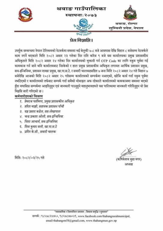 भुक्तानी दिने अन्तिम दिन रोल्पाको थबाङ गाउँपालिकाका प्रमुख प्रशासकीय अधिकृतसहित ७ कर्मचारी सम्पर्कविहीन