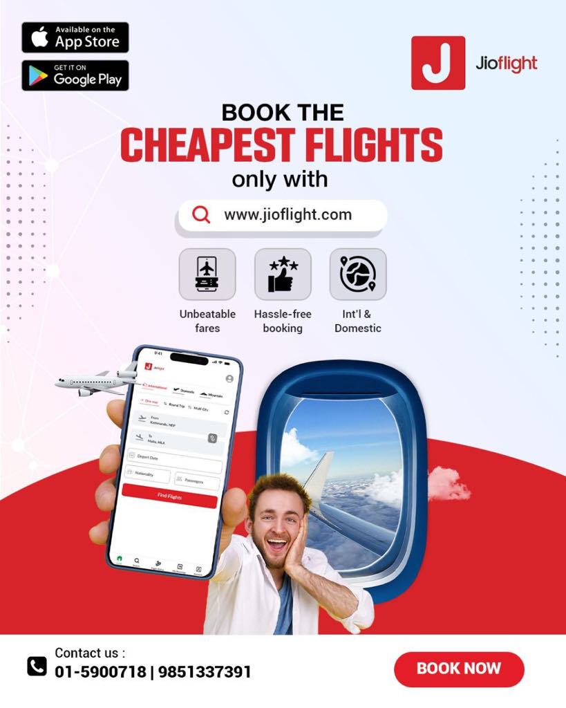 काठमाडौं । उपभोक्ताहरुलाई सरल र सस्तो मूल्यमा हवाई टिकट सहितको सेवा सुविधा उपलब्ध गराउने उद्देश्य अनुरुप ‘जिओ फ्लाईट’ संचालनमा आएको छ ।