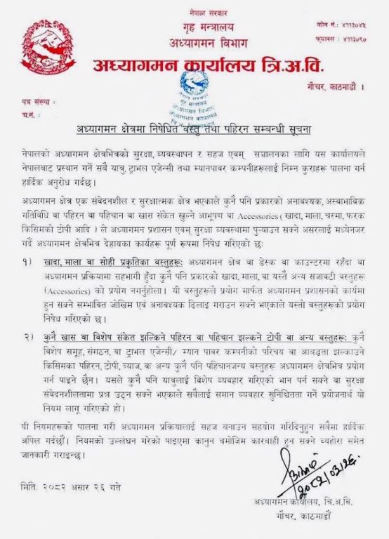 अध्यागमन प्रक्रियामा सहभागी हुँदा वा काउन्टरमा रहँदा कुनै पनि प्रकारको खादा, माला वा अन्य सजावटी वस्तु (एक्सेसोरिज) प्रयोग गर्न पाइने छैन । यस्ता वस्तुले सुरक्षा जोखिम बढाउन र प्रक्रियामा ढिलाइ गर्न सक्ने कार्यालयको भनाइ छ ।