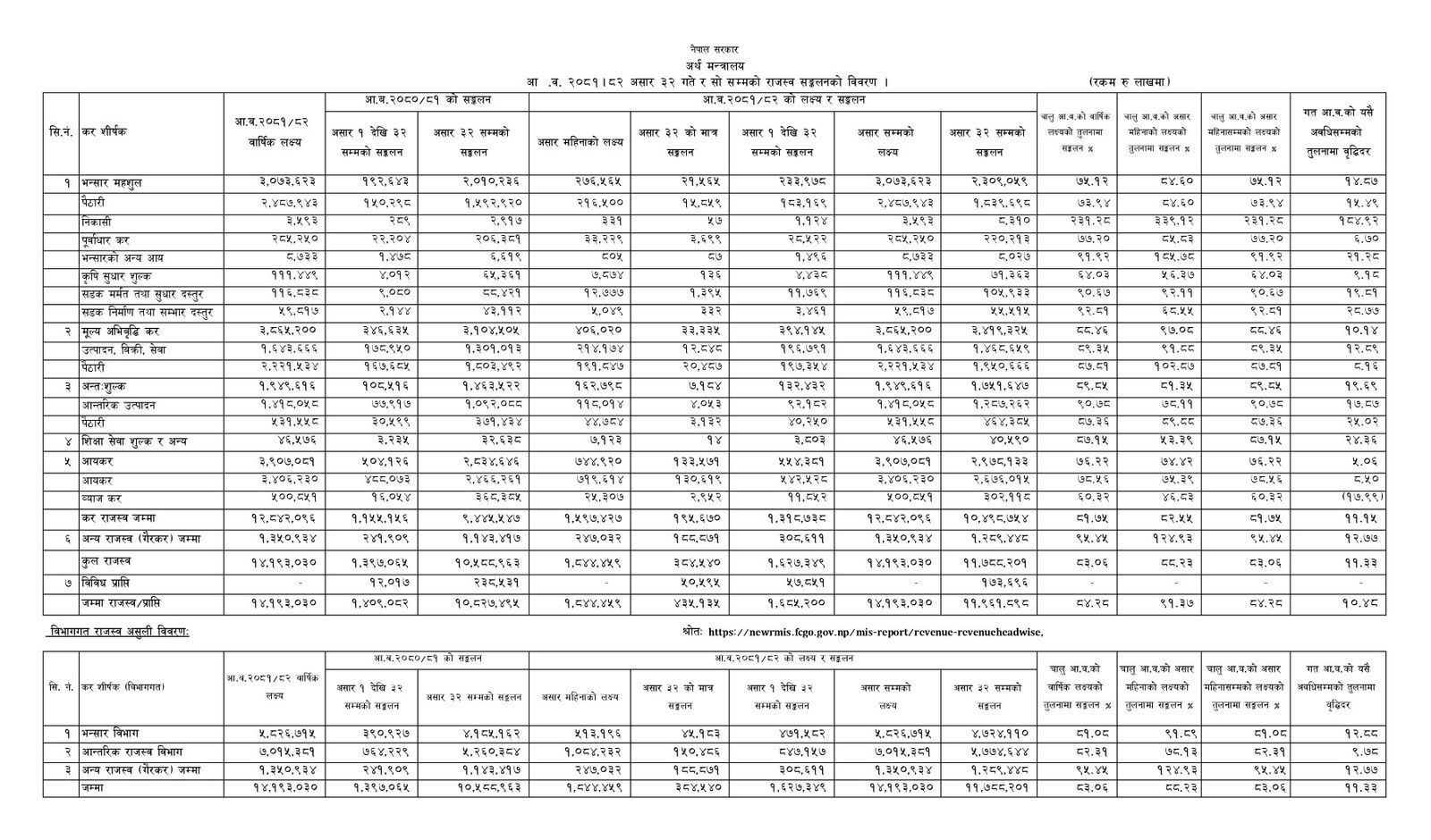 आर्थिक वर्ष २०८१/०८२ मा १४ खर्ब १९ अर्ब राजस्व संकलन गर्ने लक्ष्य थियो । अर्ध वार्षिक समीक्षामा संशोधन गरी १२ खर्ब ८६ अर्बको लक्ष्य तय गरिएको थियो । संशोधित लक्ष्य अनुसार ९१.६० प्रतिशत राजस्व संकलन भएको छ ।