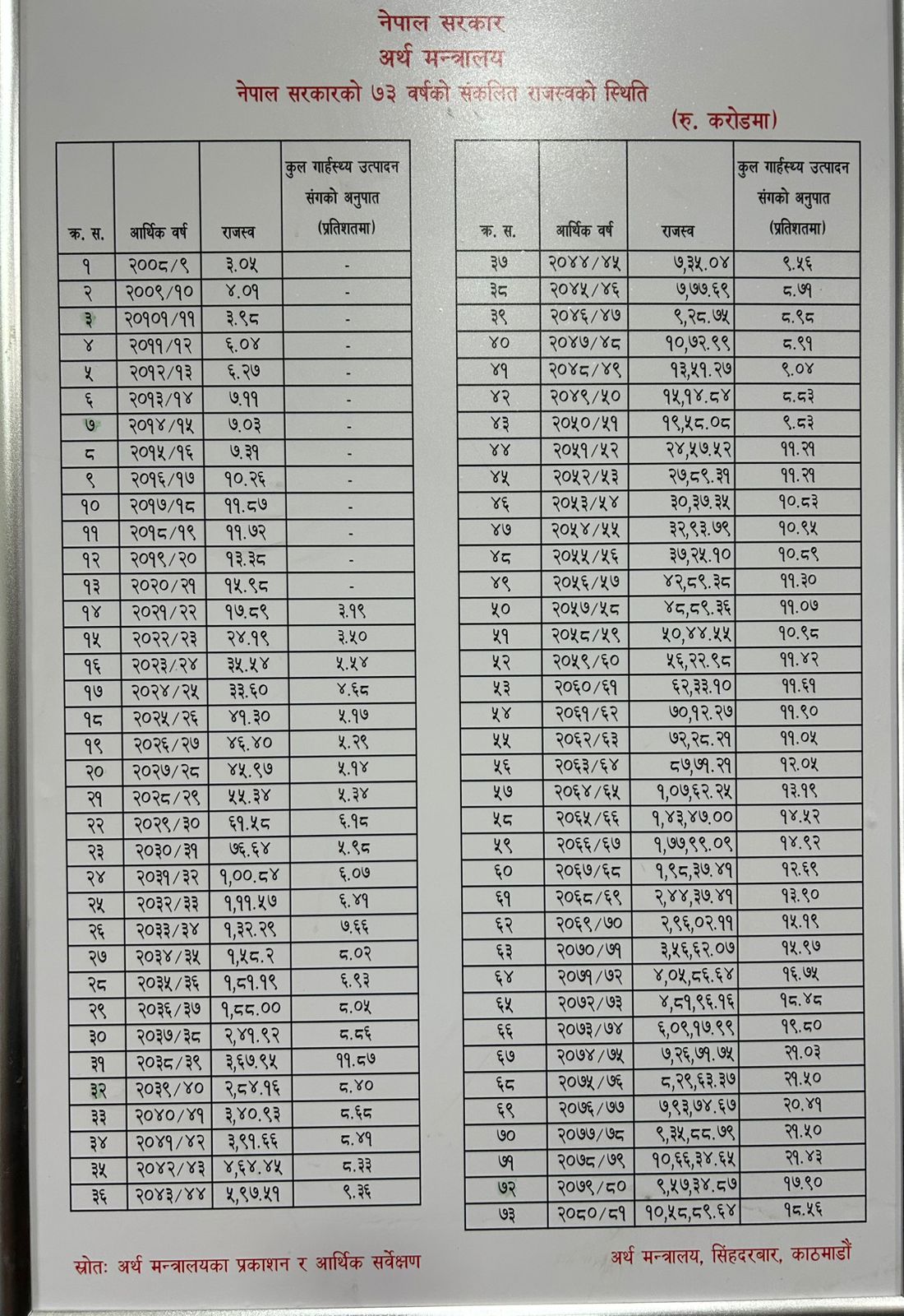 आर्थिक वर्ष २०७१/०७२ मा ४ खर्ब ५ अर्ब,  २०७२/०७३ मा ४ खर्ब ८१ अर्ब, २०७३/०७४ मा ६ खर्ब ९ अर्ब, २०७४/०७५ मा ७ खर्ब २६ अर्ब, २०७५/०७६ मा ८ खर्ब २९ अर्ब राजस्व संकलन भएको थियो ।