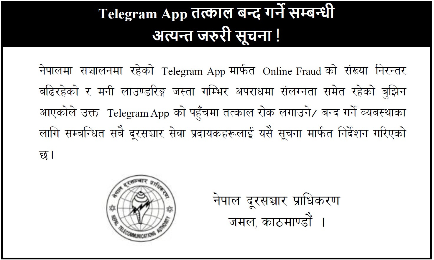 प्राधिकरणले सूचना जारी गर्दै सेवा प्रदायकहरुलाई टेलिग्राम एपको पहुँचमा तत्काल रोक लगाउन निर्देशन दिएको हो ।