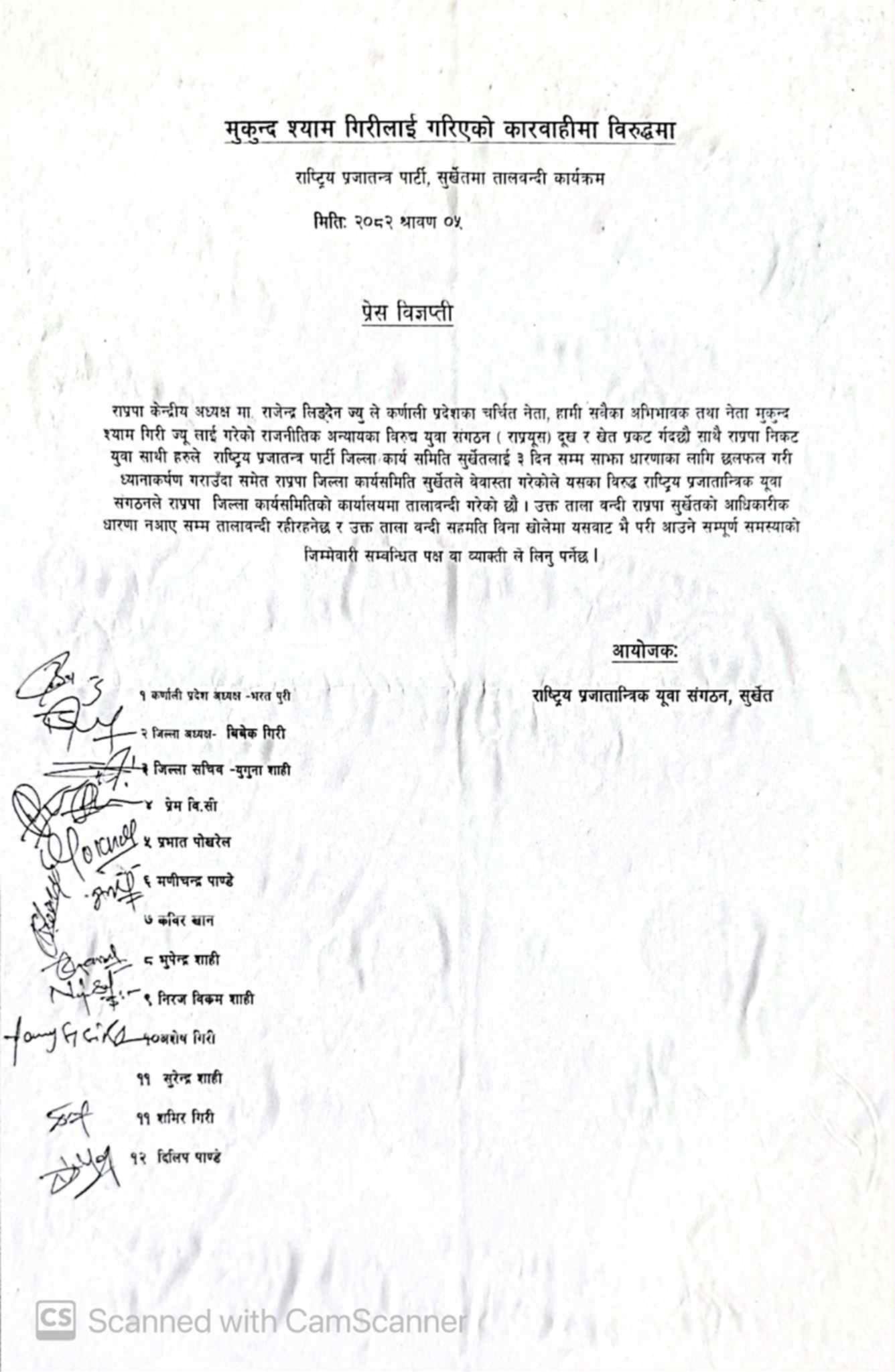 राप्रपा सुर्खेतले उपाध्यक्ष गिरीमाथि भएको कारबाहीबारे स्पष्ट धारणा नलिएसम्म तालाबन्दी जारी रहने राष्ट्रिय प्रजातान्त्रिक युवा संगठन सुर्खेतले जारी गरेको विज्ञप्तिमा उल्लेख गरिएको छ।
