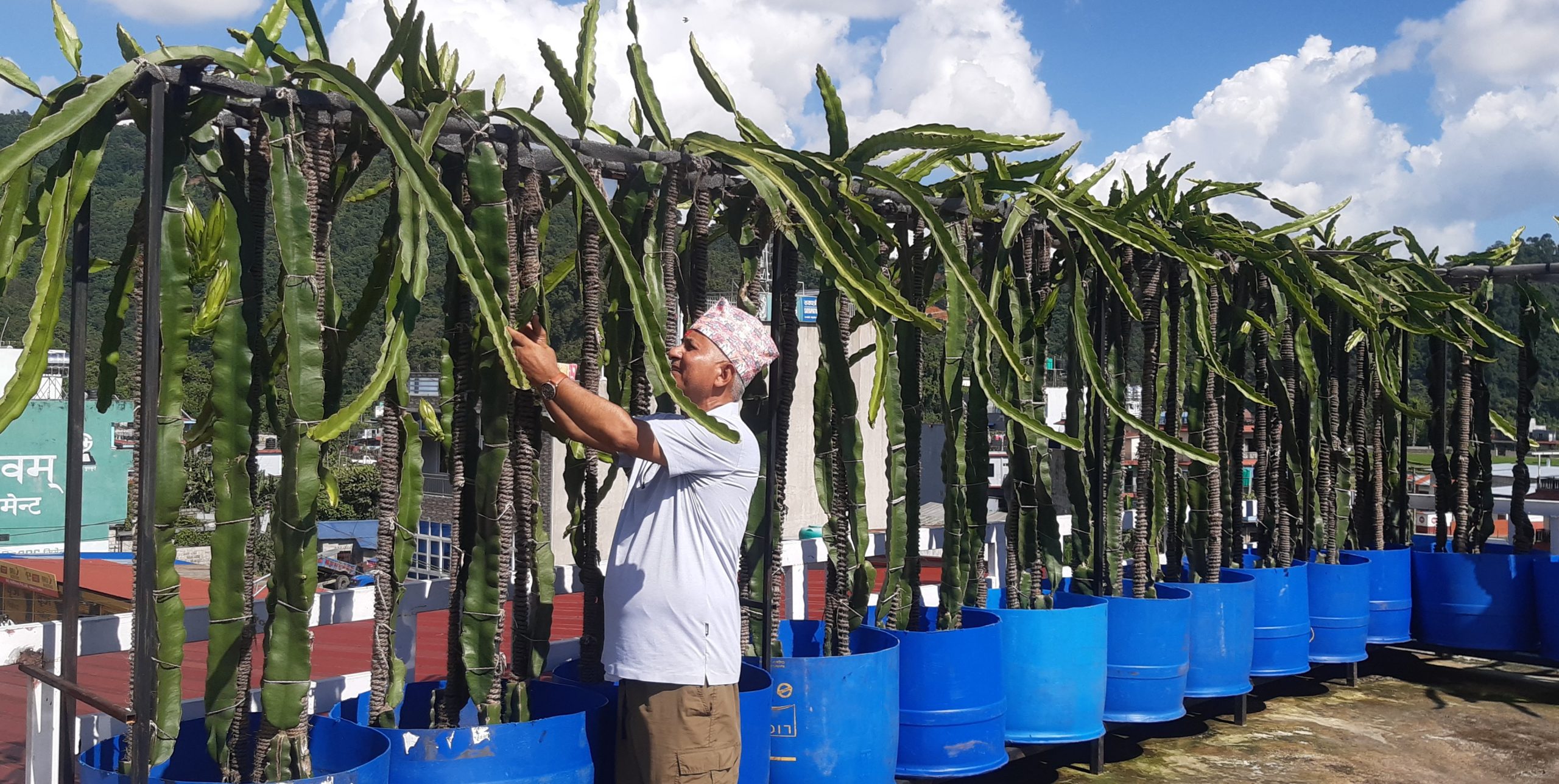 गण्डकी । पोखरा महानगरपालिका-१३ पाटनबेँसीमा पत्रकार शिरोमणि बरालले घरको कौसीमा ड्रागन फलको खेती सुरु गर्नुभएको आठ महिना भयो । उहाँको कौसीमा लगाइएका ड्रागनका बोटहरूमा फल लाग्न थालिसकेका छन् ।