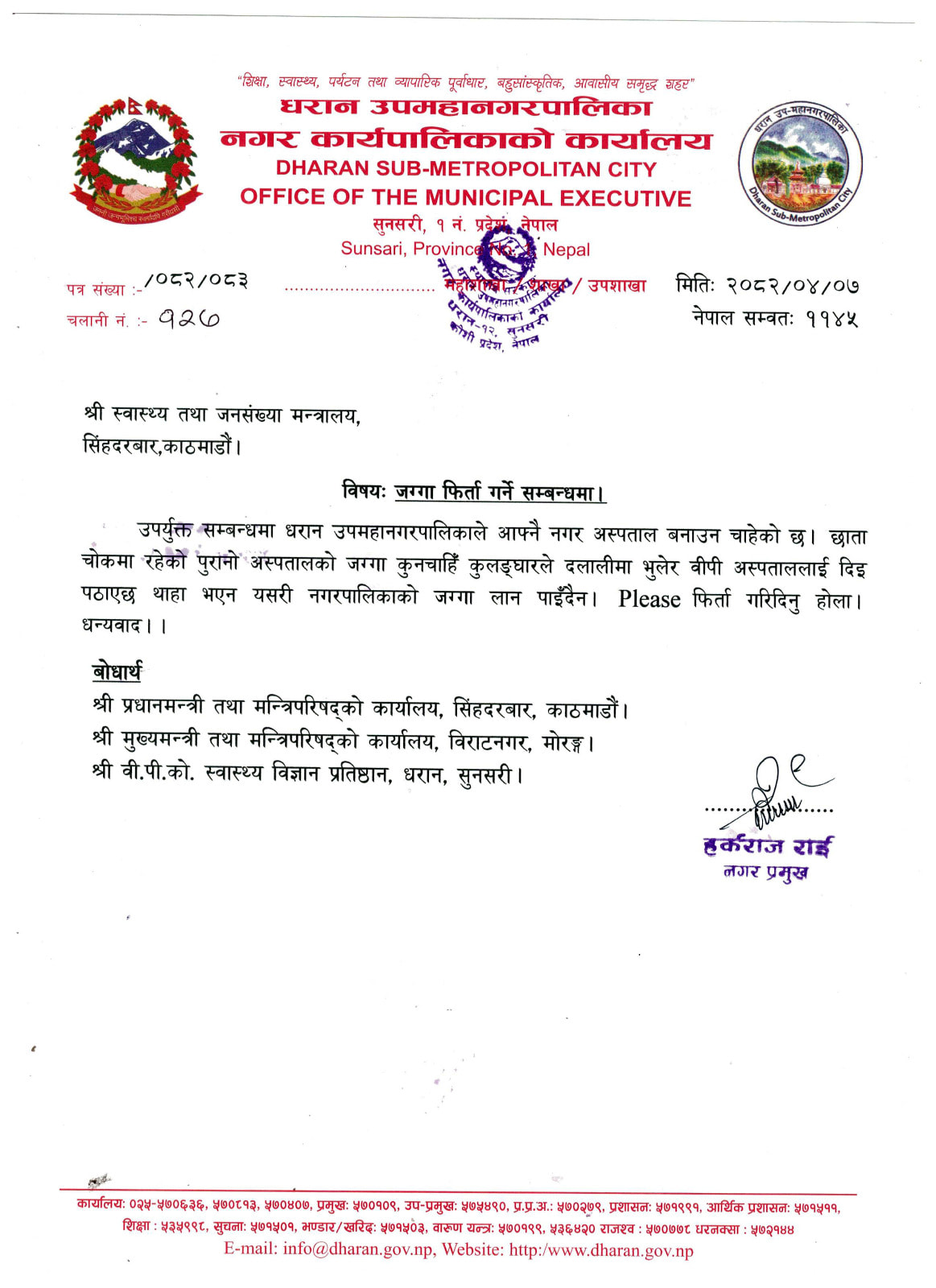 जग्गा फिर्ताका लागि मन्त्रालयलाई पत्राचार गर्दै उनले भनेका छन्– ‘उपर्युक्त सम्बन्धमा धरान उपमहानगरपालिकाले आफ्नै नगर अस्पताल बनाउन चाहेको छ । छाता चोकमा रहेको पुरानो अस्पतालको जग्गा कुनचाहिँ कुलङ्घारले दलालीमा भुलेर बीपी अस्पताललाई दिइ पठाएछ थाहा भएन यसरी नगरपालिकाको जग्गा लान पाइँदैन । प्लिज फिर्ता गरिदिनु होला । धन्यवाद ।’