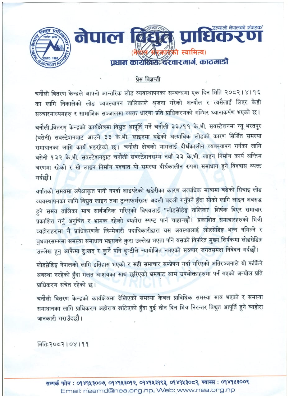 प्राधिकरणले आइतबार विज्ञप्ति जारी गर्दै चितवनमा लाइन अवरुद्ध हुने समय तालिका मात्रै सार्वजनिक भएको तर लोडसेडिङ नभएको प्रस्ट पारेको हो ।