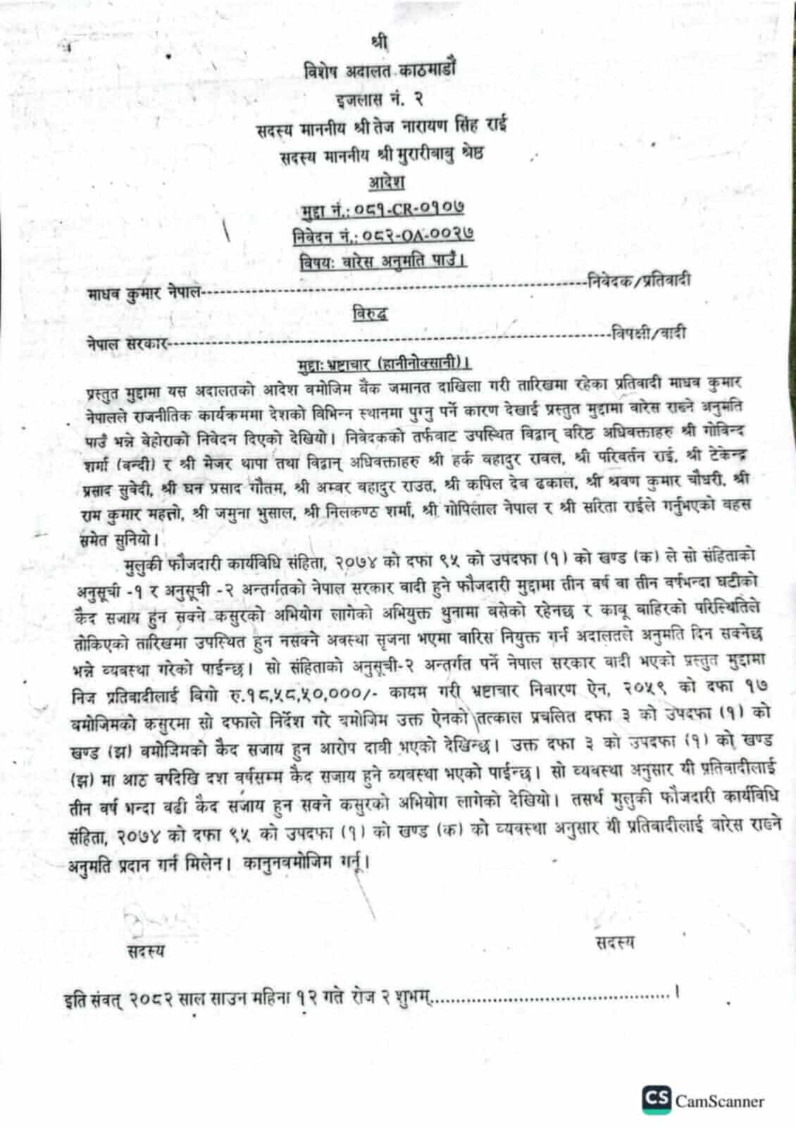 उक्त निवेदनउपर सोमबार विशेष अदालतका न्यायाधीश तेजनारायणसिंह राई र मुरारीबाबु श्रेष्ठको इजलासले सुनुवाइपछि वारेस सुविधा दिन अस्वीकार गरेको हो ।