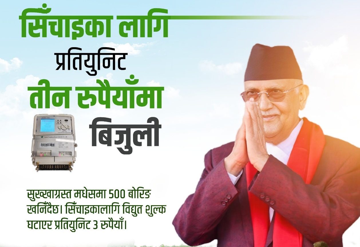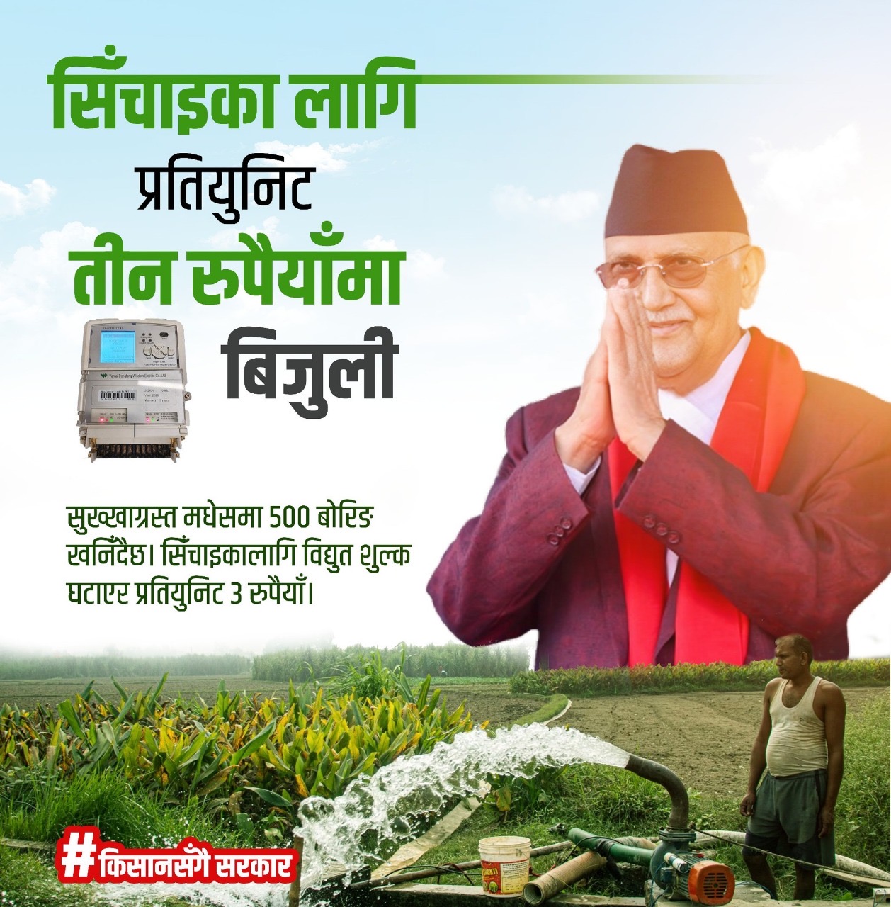 पानी नपरेर सिँचाइमा समस्या भएपछि सरकारले यो निर्णय लिएकाले हो ।  प्रधानमन्त्री केपी शर्मा ओलीले सामाजिक सञ्जालमार्फत किसानका लागि सिँचाइ सुविधामा सुधार ल्याउने उद्देश्यले सरकारले उक्त योजना कार्यान्वयनमा ल्याएको उल्लेख गर्नु भएको छ । ‘तराईमा ५०० वटा डिप बोरिङ खन्ने काम सुरु भएको छ, सिँचाइका लागि किसानलाई प्रतियुनिट बिजुलीको ३ रुपैयाँ मात्र लाग्नेछ’, प्रधानमन्त्रीले फेसबुकमा लेख्नु भएको छ ।