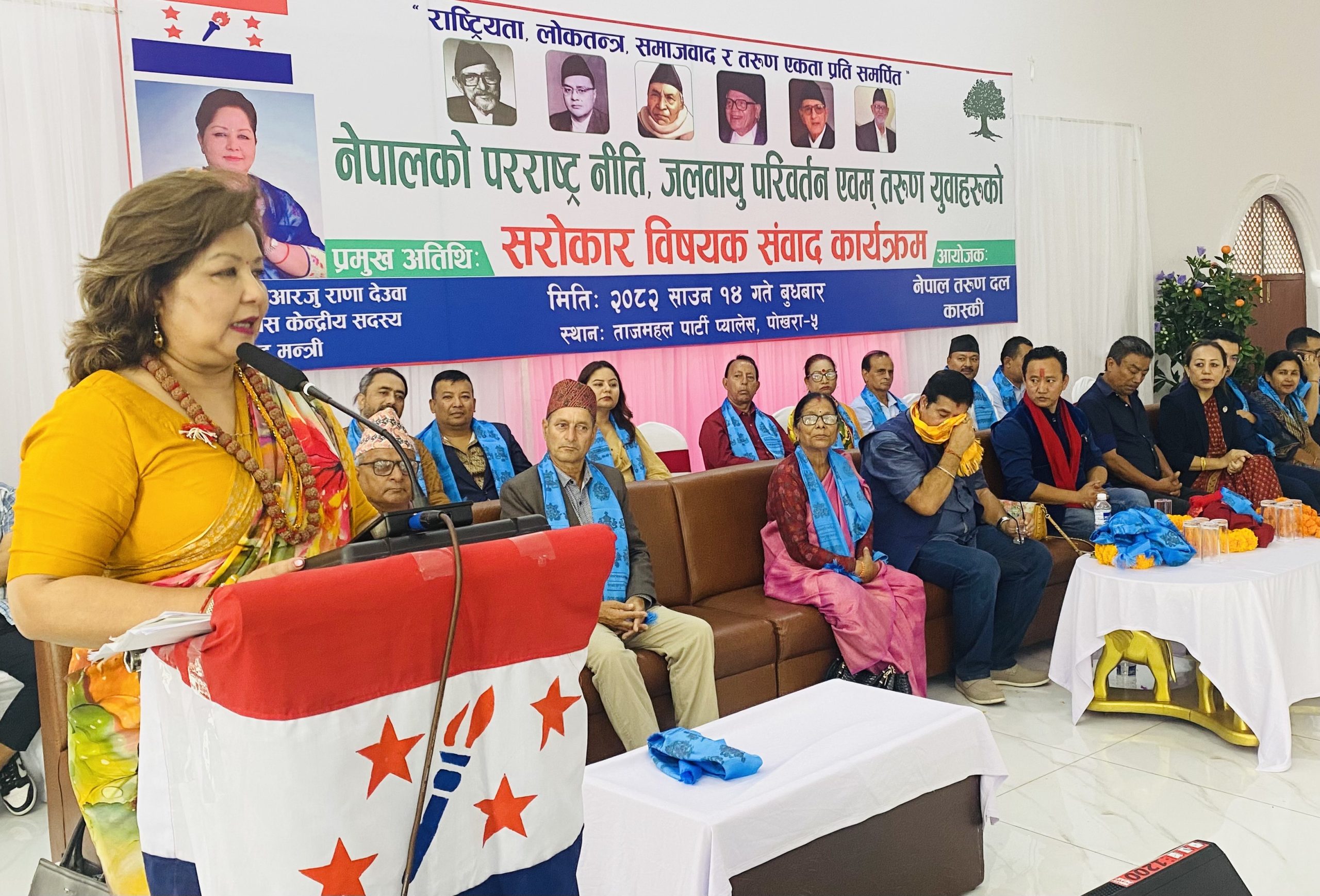 गण्डकी । परराष्ट्रमन्त्री डा आरजु राणा देउवाले नेपालले अन्तरराष्ट्रिय जगत्मा जलवायु न्यायको विषयलाई सशक्त ढङ्गले उठाउँदै आएको बताउनुभएको छ । नेपाल तरुण दल कास्कीद्वारा आज पोखरामा आयोजित ‘नेपालको परराष्ट्रनीति, जलवायु परिवर्तन एवं तरुण युवाहरुको सरोकार विषयक संवाद कार्यक्रम’मा उहाँले नेपाललाई जलवायुजन्य हानिनोक्सानीसम्बन्धी अन्तरराष्ट्रिय कोषबाट क्षतिपूर्ति दिनुपर्ने धारणा राख्नुभयो ।