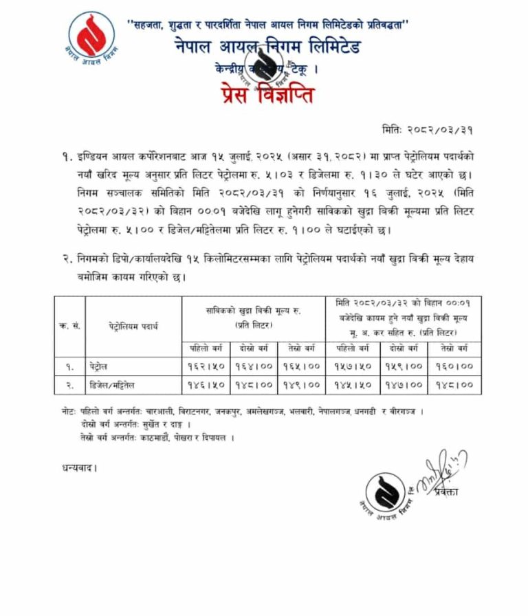 यस अनुसार पेट्रोल १ रुपैयाँले घटेर आएको छ । डिजेल तथा मट्टीतेल २ रुपैयाँले बढेको छ भने आन्तरिक हवाई इन्धन ३ रुपैयाँले बढेको छ ।