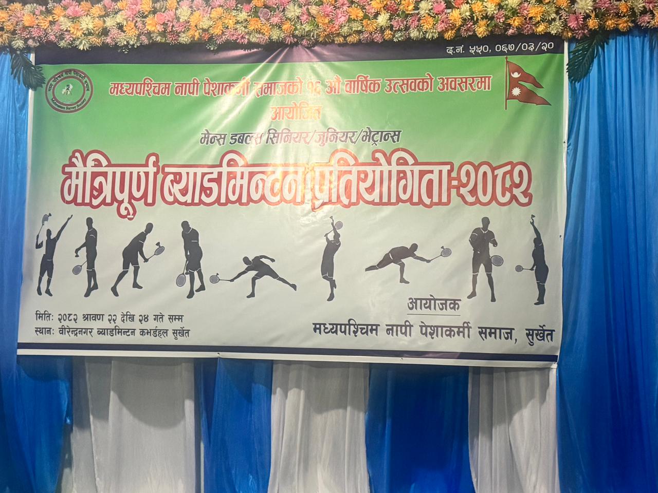 सुर्खेत। मध्यपश्चिम नापी पेशाकर्मी समाजको १६औं स्थापना दिवसको अवसरमा ब्याटमिन्टन प्रतियोगिता आयोजना हुने भएको छ । यही साउन २२ गतेदेखि सुरु हुने प्रतियोगिता जिल्ला ब्याटमिन्टन संघको कभर्ड हल, सुर्खेतमा सञ्चालन गरिनेछ ।