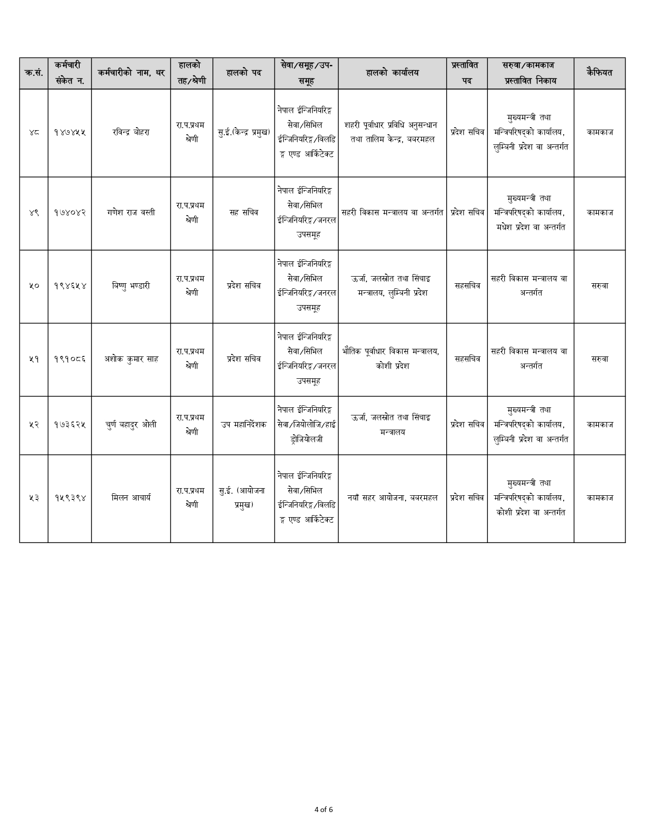 विवरण अनुसार, सामान्य प्रशासन मन्त्रालयको अतिरिक्त समूहमा राखिएका रुद्र प्रसाद लामिछानेलाई थारु आयोगमा सरुवा गरिएको छ । यस्तै, सहसचिवहरु हेमराज सुवेदीलाई स्वास्थ्य मन्त्रालय, निता