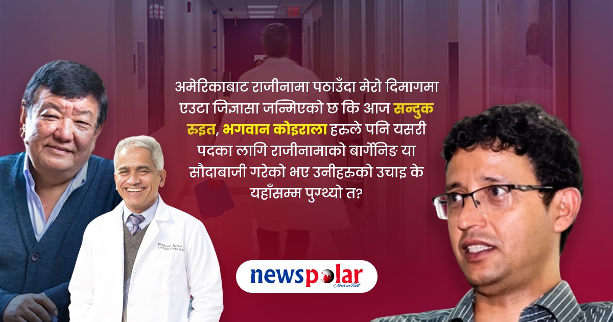 काठमाडौं: हिजोदेखि नेपालका सामाजिक सञ्जालमा एउटा बहस बडो जोडतोडका साथ उठेको छ एकजना चिकित्सक रामेश कोइरालाले देश छोडे भनेर । उनले उपकुलपति पदमा नियुक्ति चहन्थे रे, नपाएपछि अमेरिका पुगेर राजीनामा पठाए रे । चर्चाको विषय यही हो ।