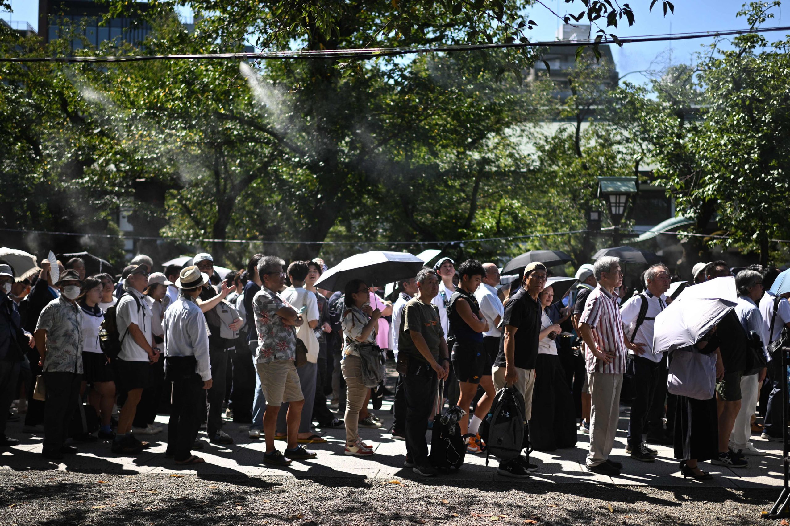People queue up to pay their respect and say prayers during a visit to the Yasukuni Shrine in Tokyo on August 15, 2025, on the 80th anniversary of Japan’s surrender in World War II. (Photo by Philip FONG / AFP)