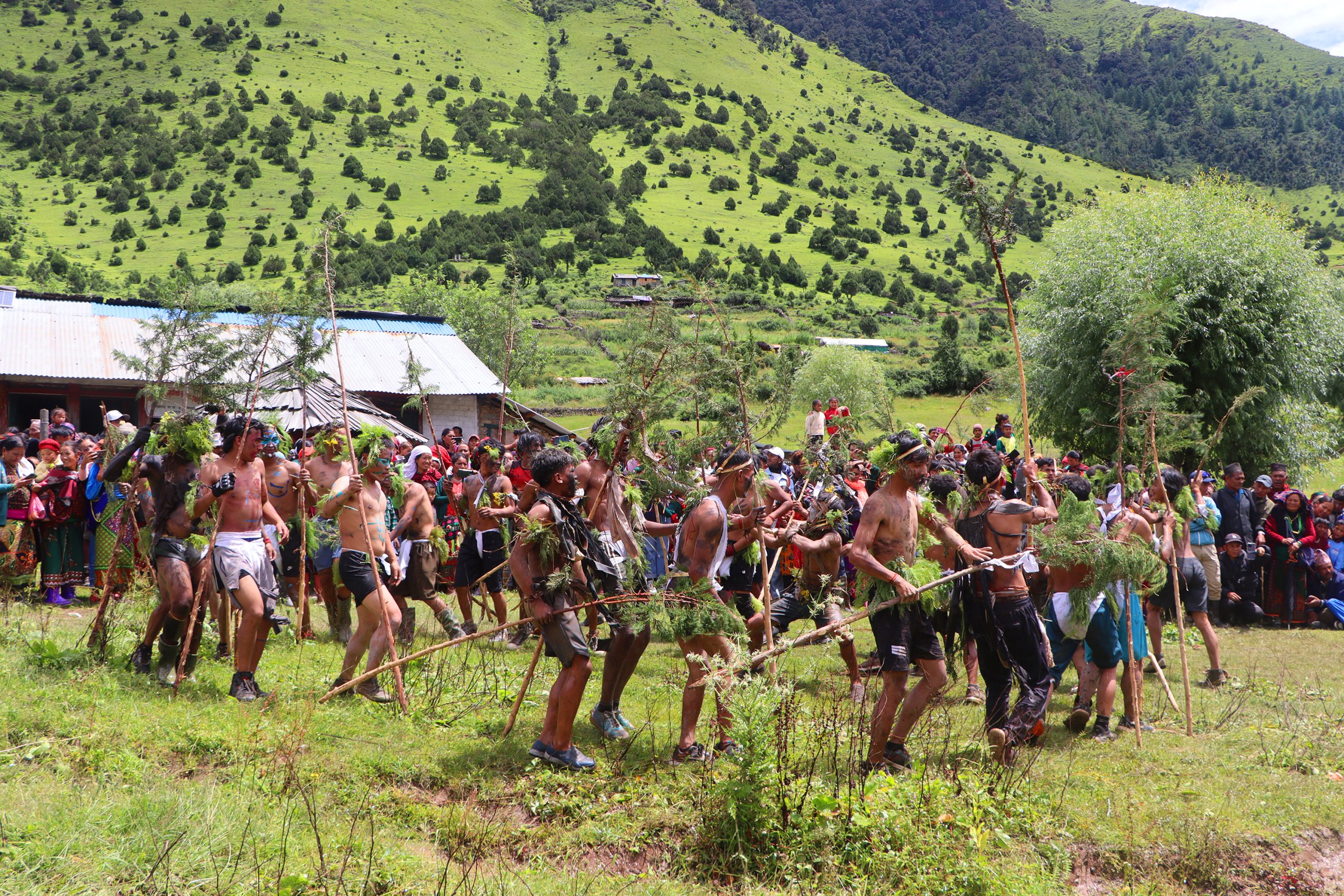 ढोरपाटन, (बागलुङ) । अर्ध नग्न शरीर, मोसोले छोपिएको अनुहार र छाति, कम्मरमा सेतो कपडा बाँधेर हातमा धुपीको हाँगो समातेर केही युवा दौडिँदै थिए । ती युवाका पछि ढ्याङ्ग्रो ठट्याउँदै आइरहेका थिए, झाँक्रीहरु । माथिदेखि दौडिँदै आएको झाँक्री र एक हुल युवाको दृश्य अनौठो थियो । यो अवसरको साक्षी बन्न निसेलढोरमा सयौँ मानिस जम्मा भएका थिए ।