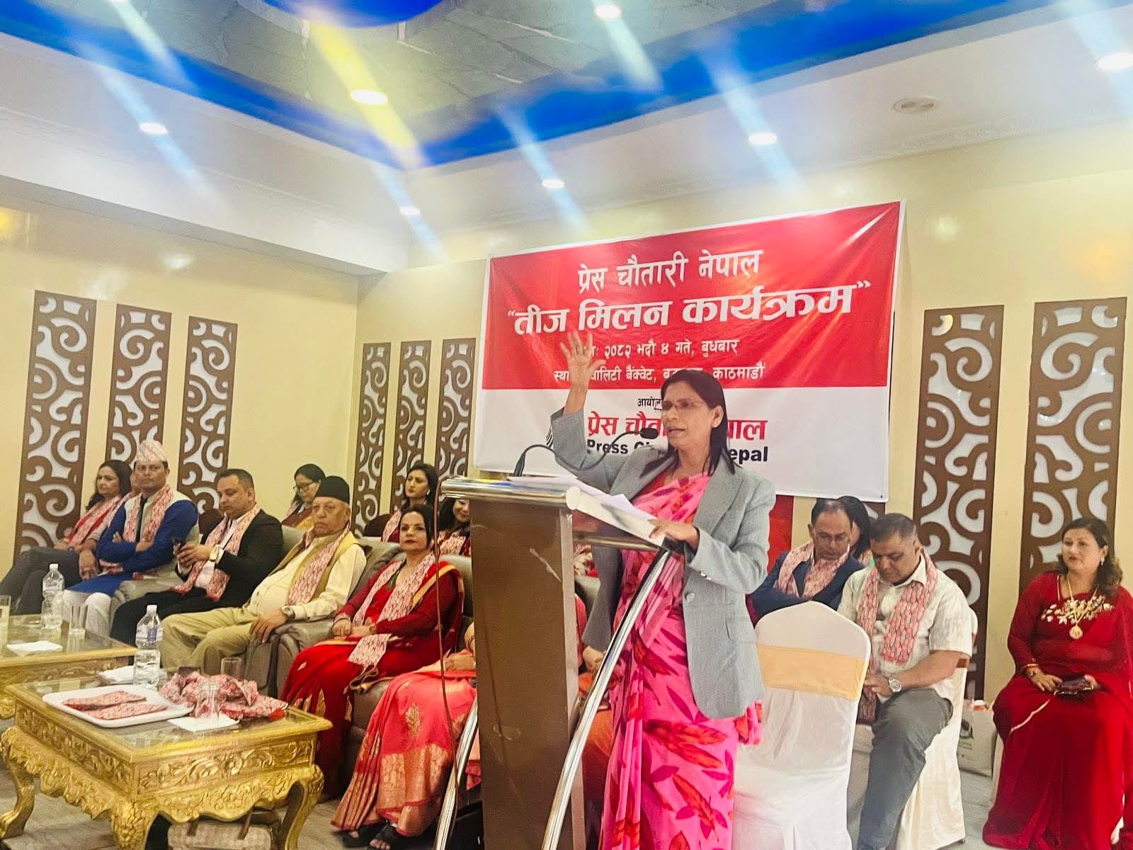 प्रेस चौतारी नेपालले आज यहाँ आयोजना गरेको ‘तीज मिलन’ कार्यक्रममा उहाँले हिजोका पुस्ताले तीजलाई विभेदको पर्खाल तोड्ने अस्त्र बनाएको र अहिलेको पुस्ताले यसको मौलिकपनको संरक्षण गर्नुपर्ने बताउनुभएको हो ।