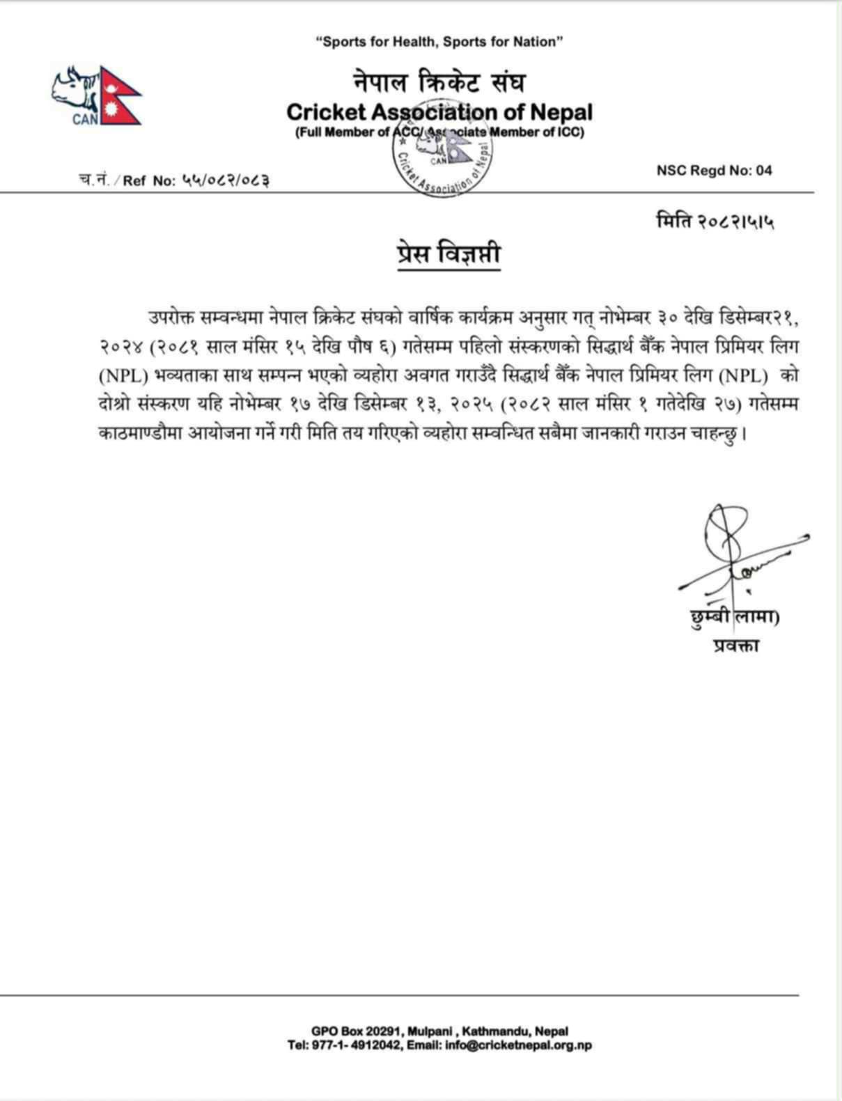 बिहीबार नेपाल क्रिकेट संघ (क्यान) ले एक विज्ञप्ति जारी गर्दै दोस्रो संस्करणको एनपिएलको मिति तोकेको हो ।