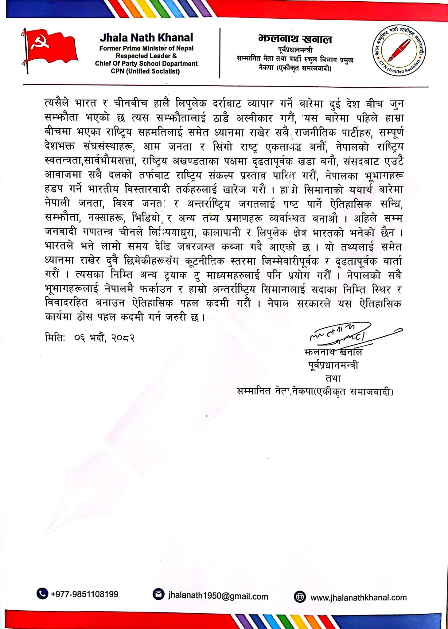 काठमाडौँ । नेकपा (एकीकृत समाजवादी)का सम्मानीत नेता एवं पूर्व प्रधानमन्त्री झलनाथ खनालले भारत र चीनबीचको लिपुलेक सम्झौताको कडा विरोध गरेका छन् ।