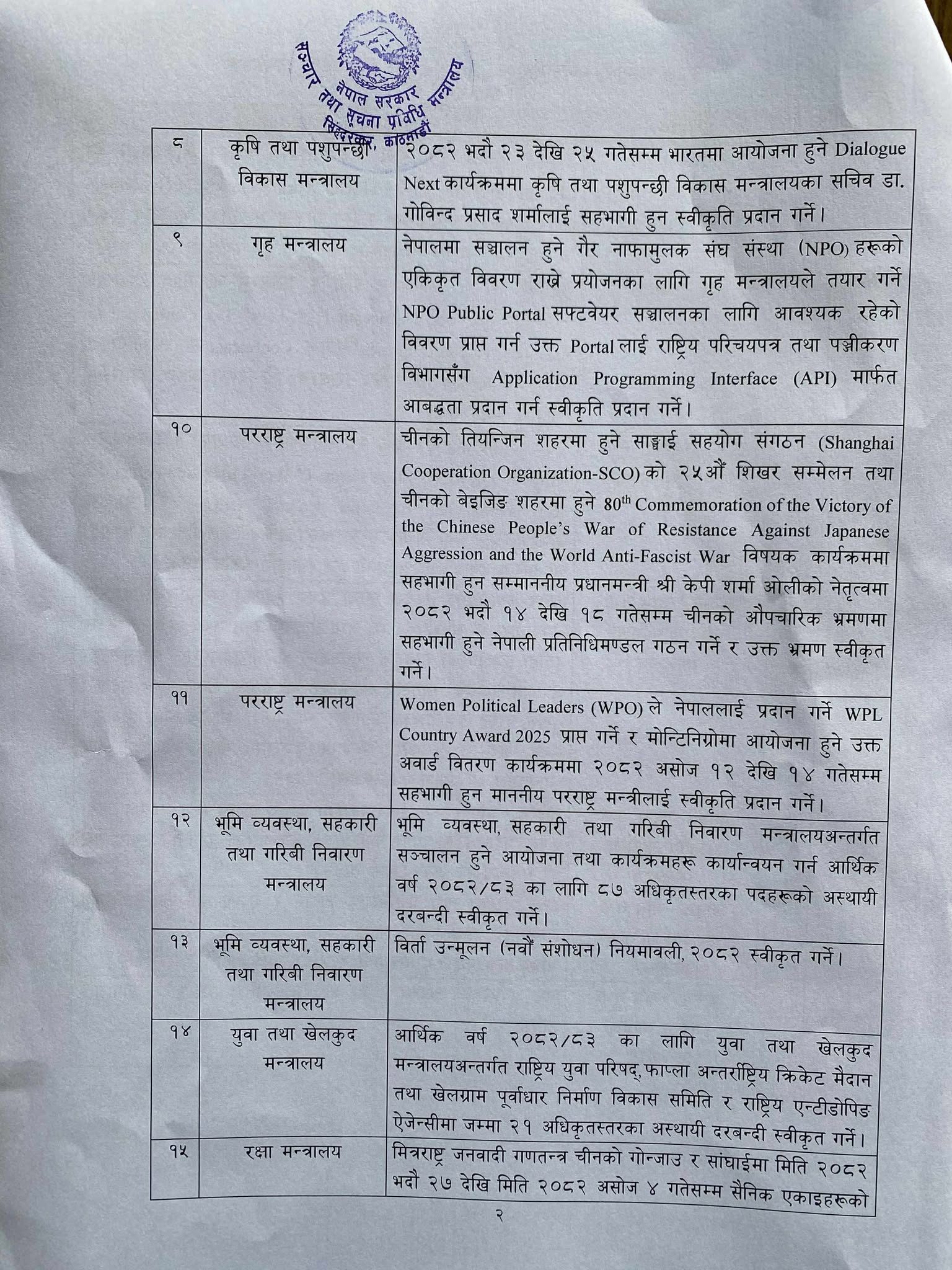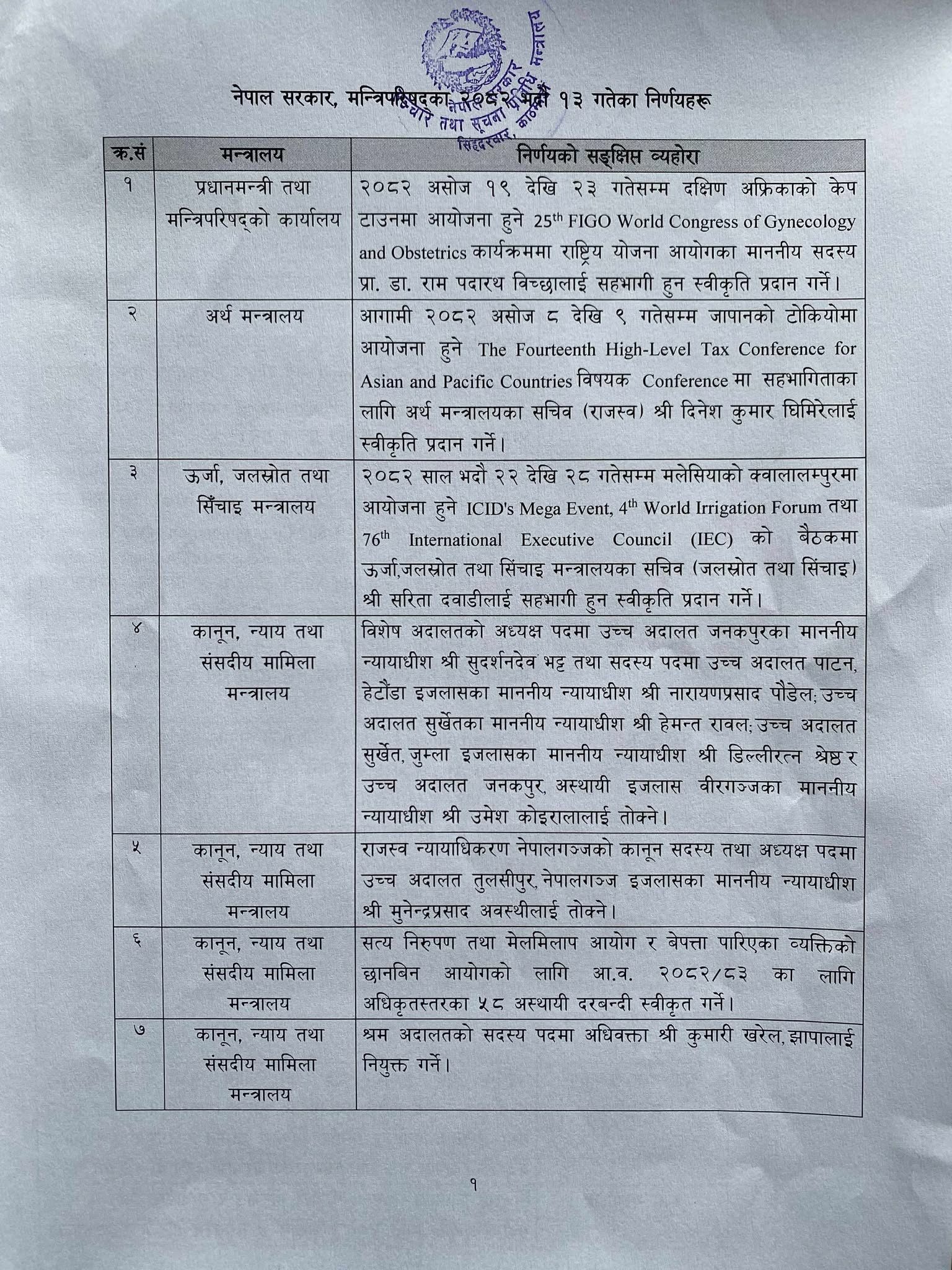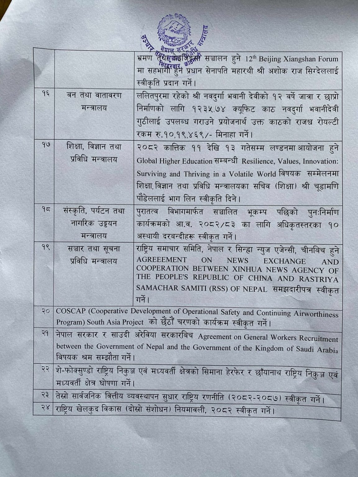 काठमाडौं । मन्त्रिपरिषद् बैठकको निर्णय सार्वजनिक गरिएको छ ।