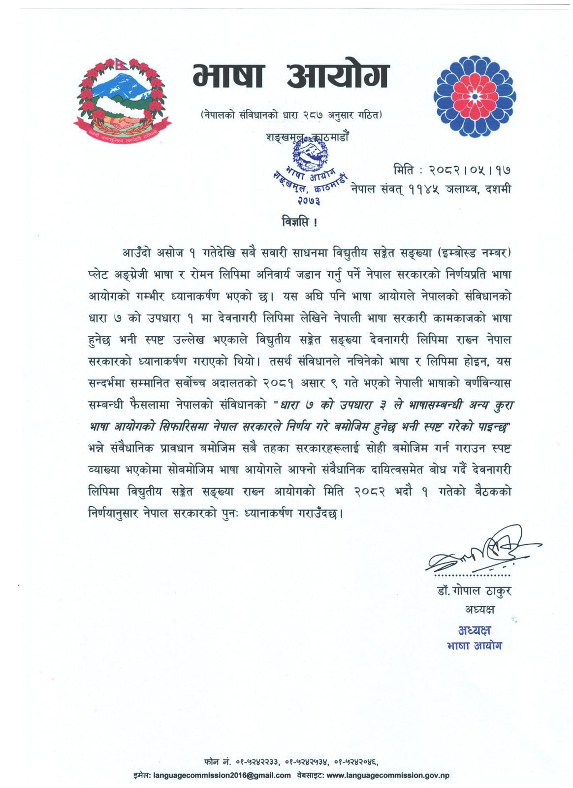 आयोगले आज विज्ञप्ति जारी गर्दै नेपाल सरकारले सवारी साधनमा देवनागरी बाहेक अन्य लिपि प्रयोग गर्न दिने निर्णय नेपालको संविधान विपरीत भएको जनाउँदै तत्काल सच्याउन आग्रह गरेको हो ।