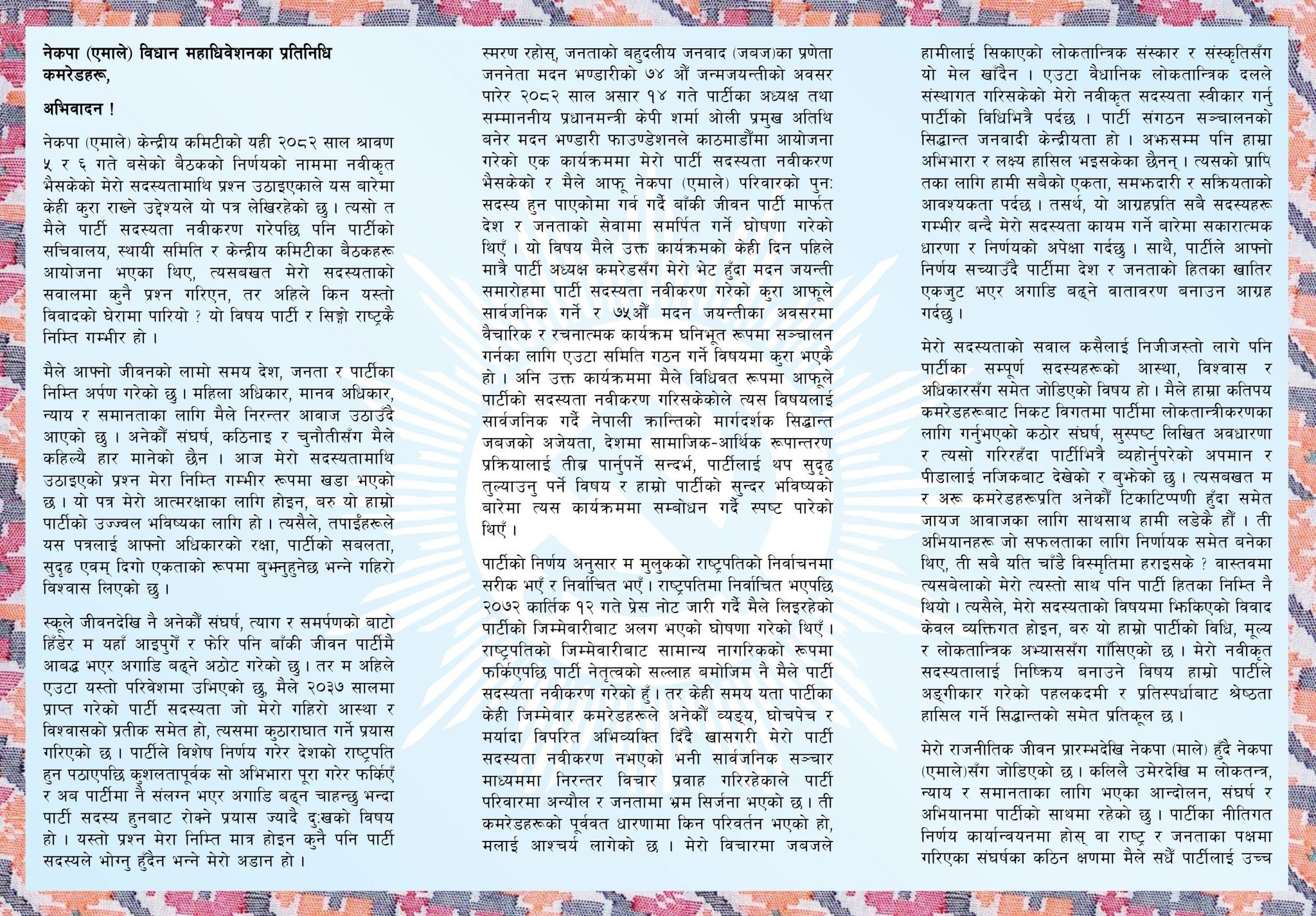 नेकपा (एमाले) केन्द्रीय कमिटीको यही २०८२ साल श्रावण ५ र ६ गते बसेको बैठकको निर्णयको नाममा नवीकृत भैसकेको मेरो सदस्यतामाथि प्रश्न उठाइएकाले यस बारेमा केही कुरा राख्ने उद्देश्यले यो पत्र लेखिरहेको छ ।